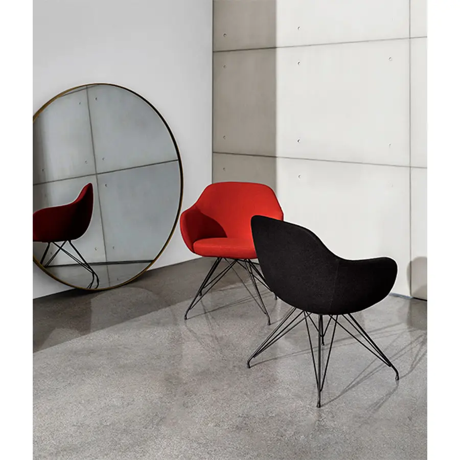 La silla Cadira tiene un asiento envolvente y confortable que combina elegancia y sencillez con cualquier tipo de mesa. La silla Cadira tiene diferentes tapizados: piel, símil piel, tela o terciopelo. Base metálica en diferentes acabados. Ideal para entornos domésticos o de trabajo. Disponible en versión con reposabrazos.