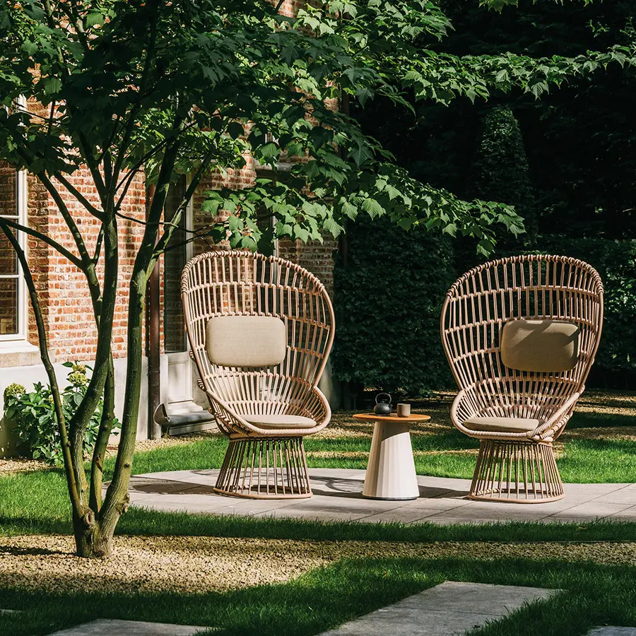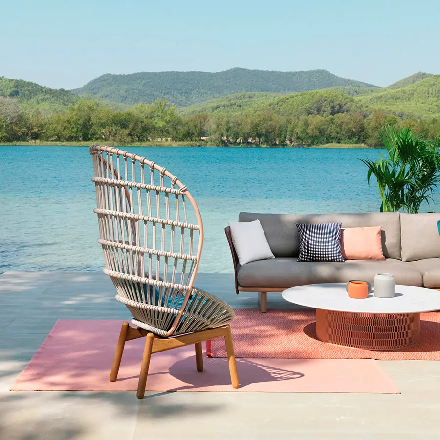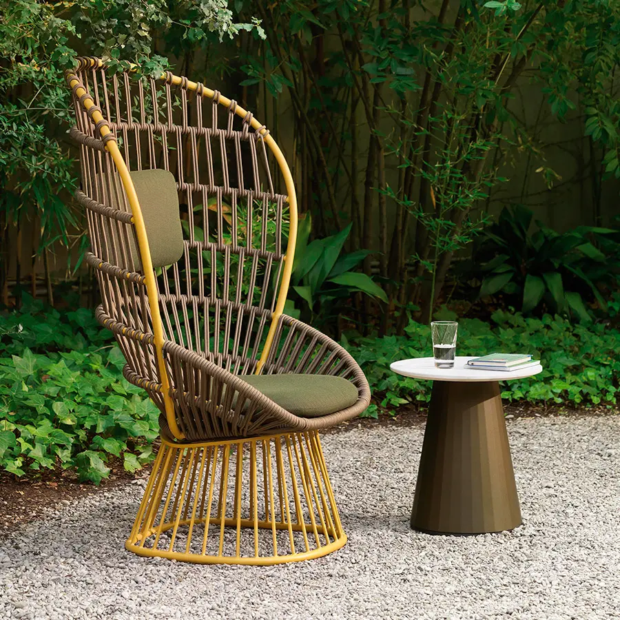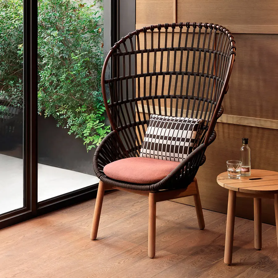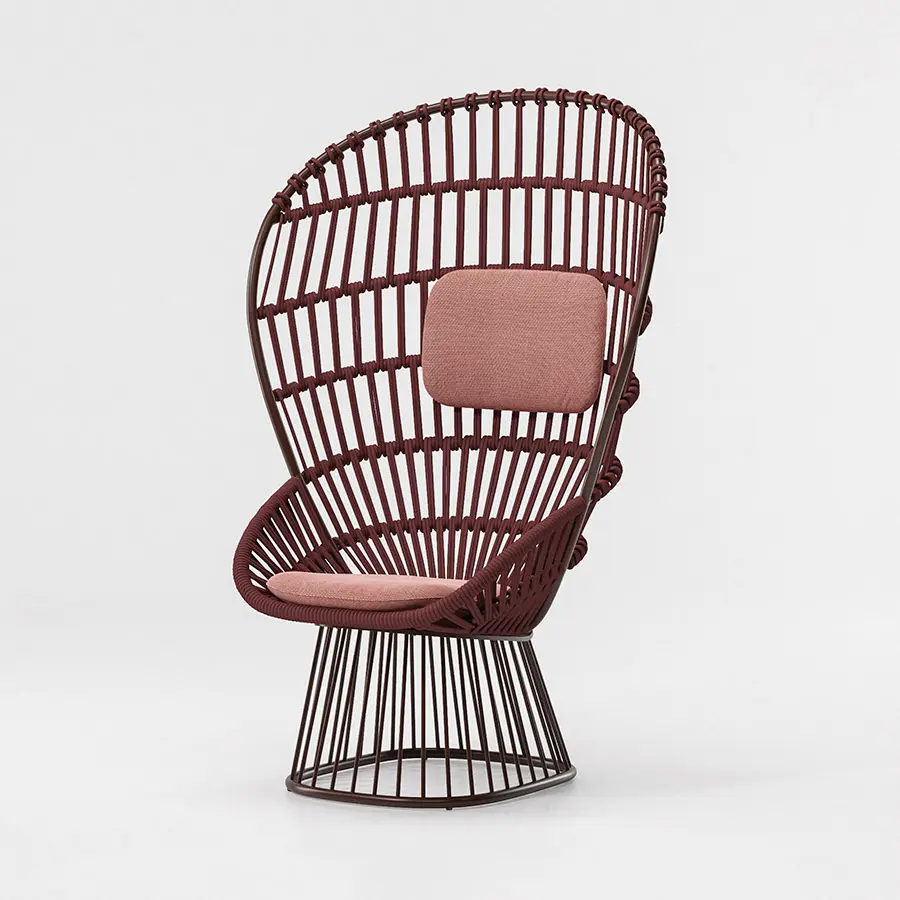 Cala es un sillón de respaldo alto inspirado en el icónico Emmanuelle. Las superficies ligeras y transparentes le confieren una presencia majestuosa. El tejido abierto de cuerda hace las veces de una celosía, que aporta privacidad visual al tiempo que mantiene una conexión con los elementos naturales. Cala se puede utilizar tanto para cenar como para relajarse. La amplia selección de revestimientos metálicos, colores de cuerda y telas para cojines ofrece numerosas posibilidades para adaptar la identidad del sillón a distintos proyectos.