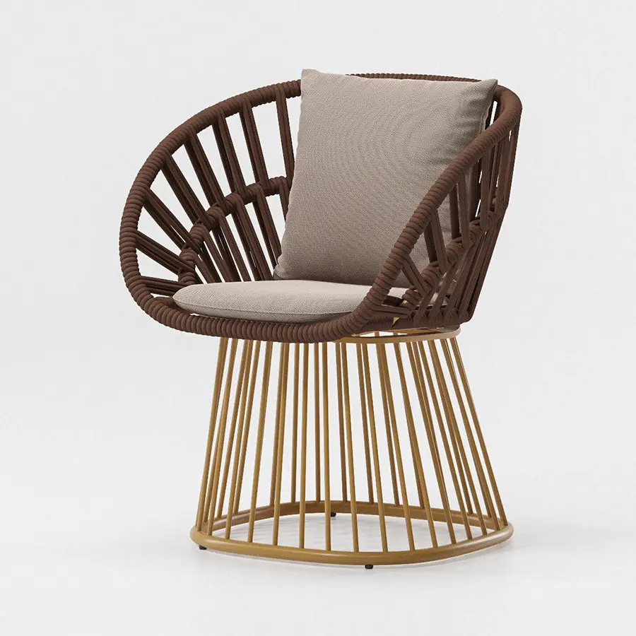 Cala es un sillón de superficies ligeras y transparentes que le confieren una presencia majestuosa. El tejido abierto de cuerda hace las veces de una celosía, que aporta privacidad visual al tiempo que mantiene una conexión con los elementos naturales. Cala se puede utilizar tanto para cenar como para relajarse. La amplia selección de revestimientos metálicos, colores de cuerda y telas para cojines ofrece numerosas posibilidades para adaptar la identidad del sillón a distintos proyectos.