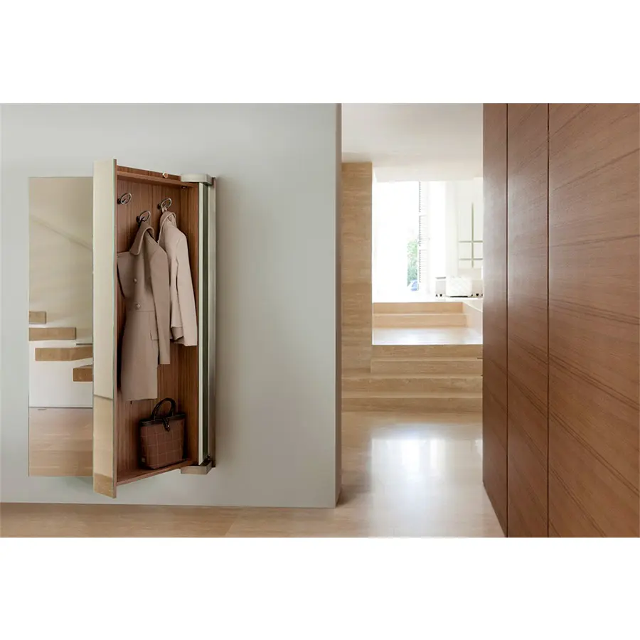 Perchero en nogal canaletta con espejo frontal. La abertura a la derecha o a la izquierda se puede eligir durante el montaje.