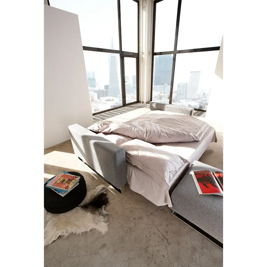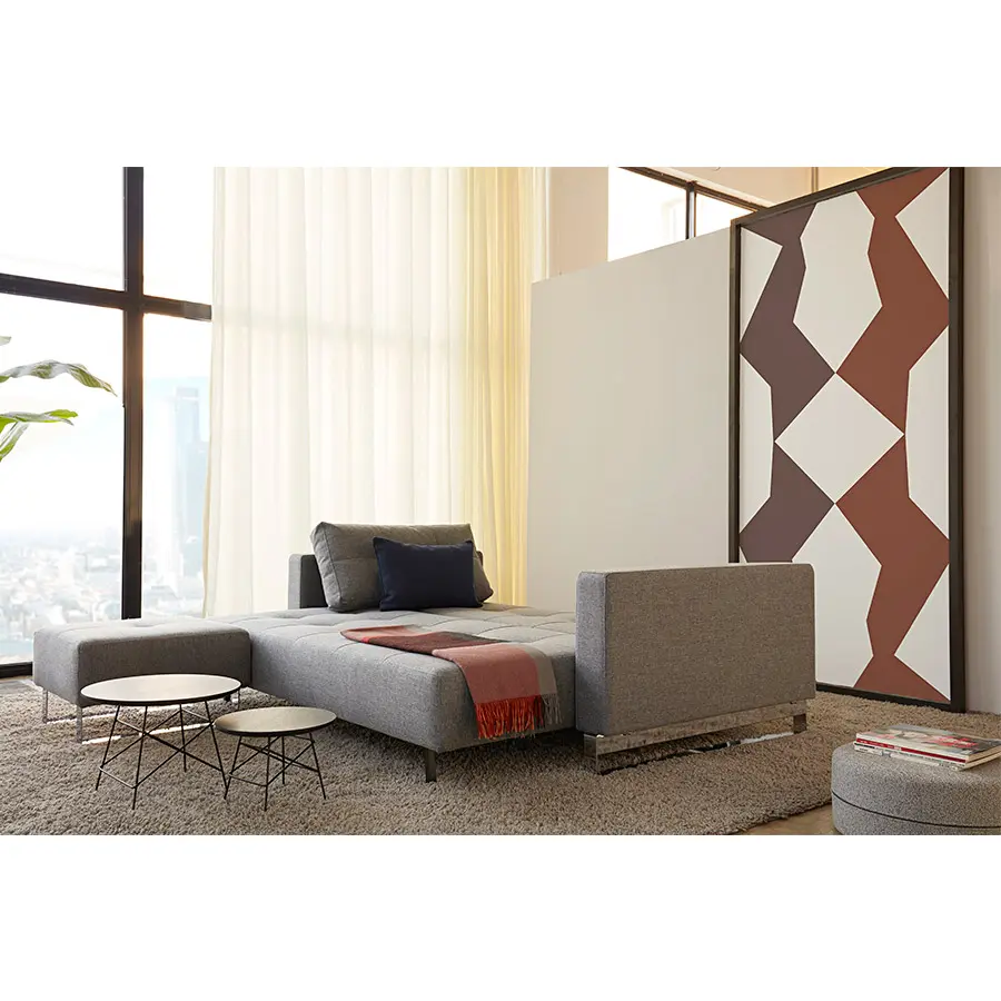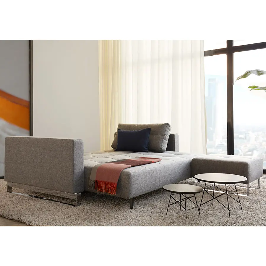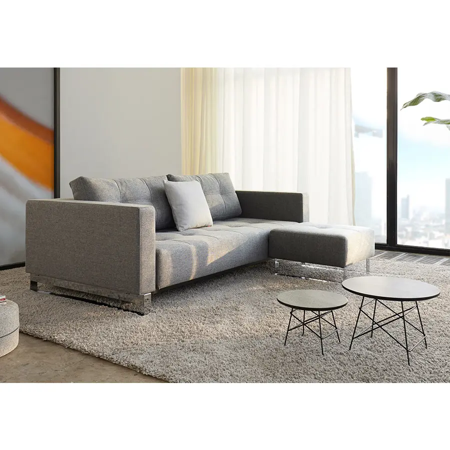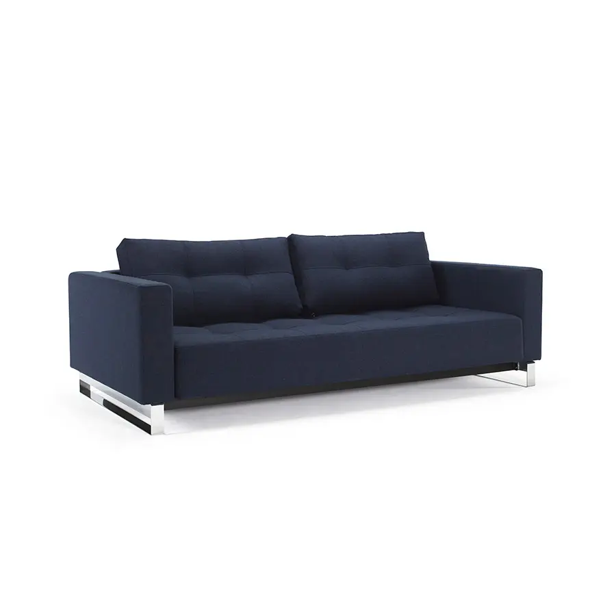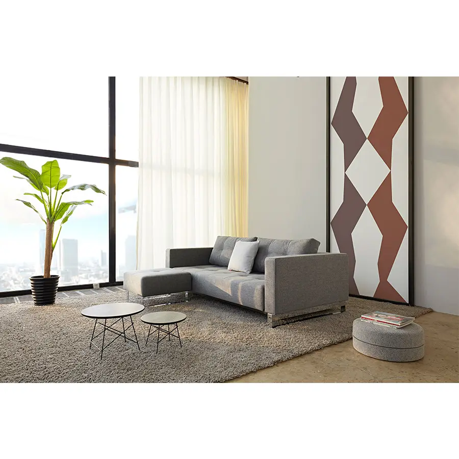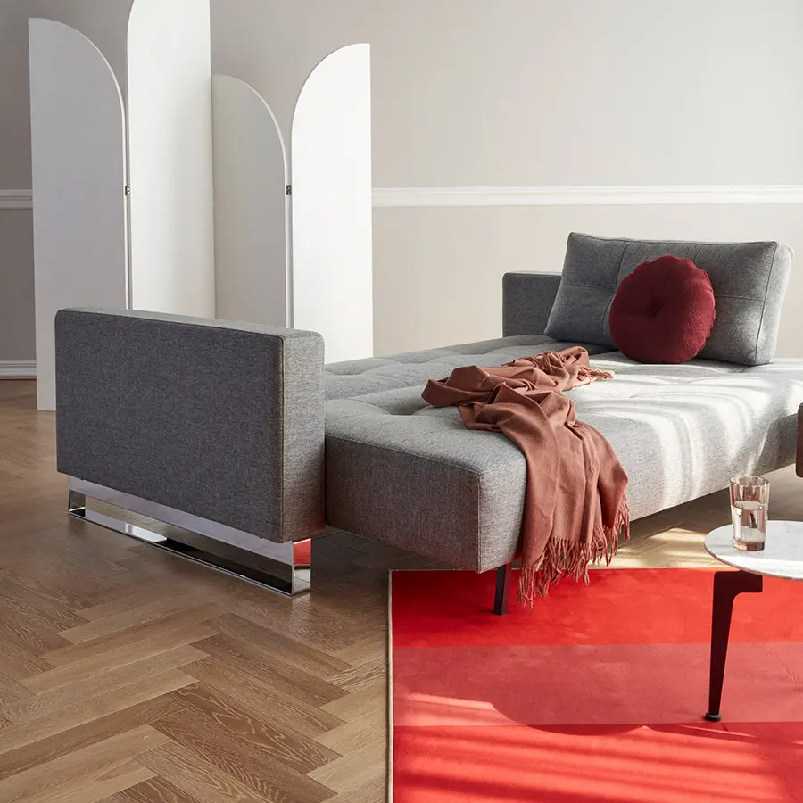 Cassius es una cama doble simple y espaciosa con un tamaño de cama de 155 x 200 cm. Un diseño de sofá clásico que se transforma en una cómoda cama con muelles cuando es necesario. Cassius tiene un diseño de sofá contemporáneo clásico con un sencillo mecanismo de transformación. El colchón de muelles ensacados y el tamaño grande de la cama garantizan la máxima comodidad durante el día y la noche. Sus exquisitos detalles cosidos de la superficie, combinados con los reposabrazos tapizados proporcionan un diseño elegante con el máximo confort para el salón. Añade el puff Cassius para completar la disposición del sofá y la chaiselongue. Medida de cama 155 x 200