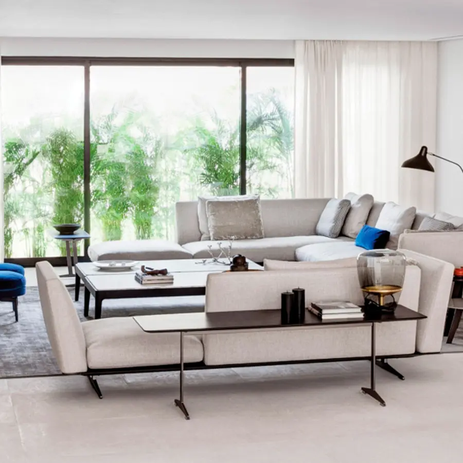 Especialmente diseñadas como elementos auxiliares del sofá del mismo nombre, las mesas de centro y las consolas Cestone cumplen la función de prácticas superficies de apoyo y ayudan a que las composiciones sean aún más dinámicas. La delgada base metálica está disponible en los acabados satinado, cromado, bruñido, cromado negro y champán, mientras que los tableros moldeados pueden ser de nogal americano y fresno barnizados en una amplia gama de colores o lacados en una paleta de tonos refinados.