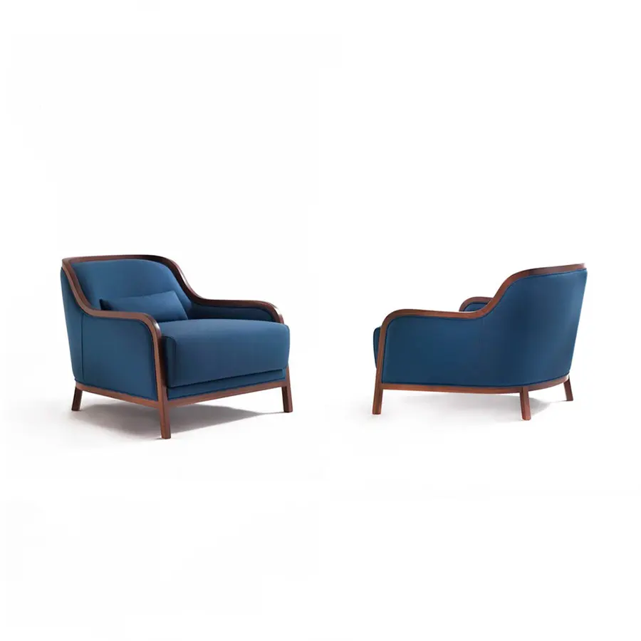 Butaca con estructura de nogal canaletta macizo, acolchadacon espuma de poliuretano de densidad variable, revestida con tela técnica protectiva. Revestimiento en las telas de la colección.