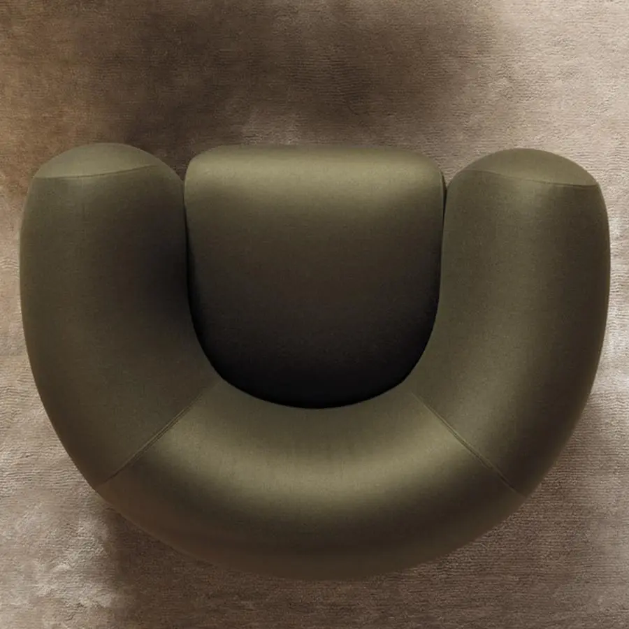 Aparentemente simple pero técnicamente compleja en su forma, Cinnamon se caracteriza por una línea redondeada en la que se asienta su estructura. La base a forma de U del sillón sigue el contorno del perímetro, mientras que el asiento abombado con el cojín extraíble está diseñado para maximizar la comodidad. Estéticamente, el sillón Cinnamon es armonioso y singular, ocultando magistralmente sus costuras para liberar la expresión de su sofisticado diseño.