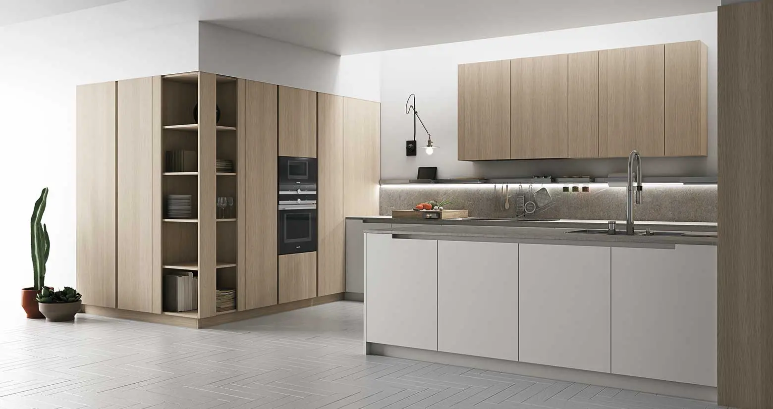 Se trata de una cocina con isla de pared de la colección D23 de Doimo. Los muebles bajos son de lacado mate, las columnas de roble Vertical Cipria y las encimeras de Pietra Piasentina fiammata, compacta y resistente.