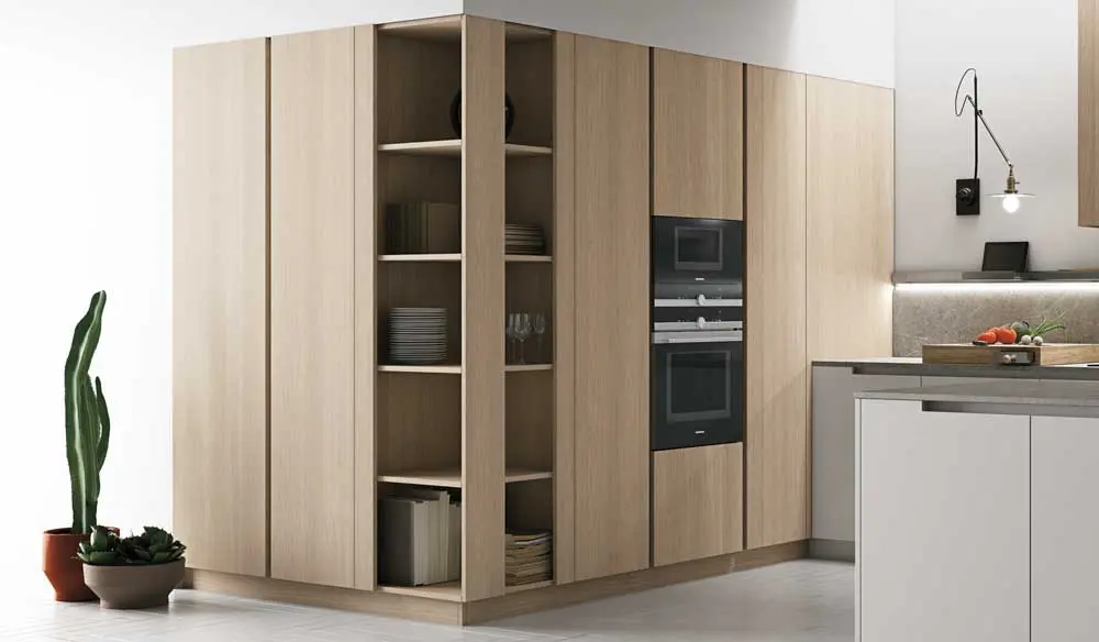 El espacio donde se desarrolla la cocina está equipado con columnas empotradas que acogen el horno y el microondas y que se abren con un elemento angular asimétrico, continuando así en forma de “L” hacia la zona de estar.