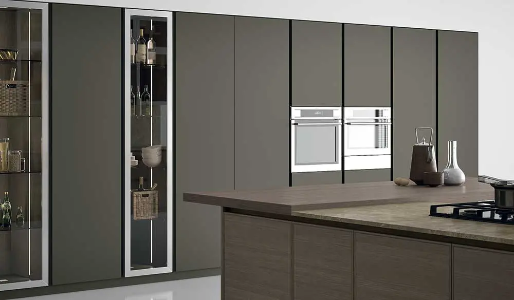 Los muebles altos de vitrina adquieren un estilo contemporáneo gracias al marco perfectamente lineal en acabado de acero inoxidable, al vidrio transparente ahumado y la iluminación interna bajo pedido.