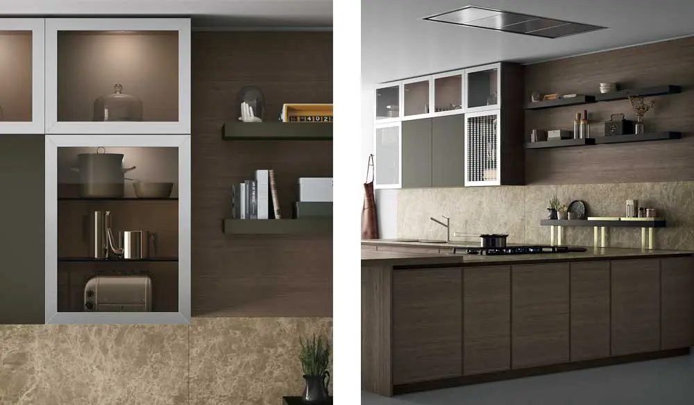 Esta cocina de la colección D23 de Doimo, cuenta con península, con encimera de mármol Monaco light y muebles bajos de roble Teñido Vite, elegantes y refinados, contemporánea gracias a los toques de latón, las puertas con marco de acero inoxidable brillante, el perfil apenas acentuado de las puertas con moldura. Las columnas con las puertas lisas, sencillas y austeras, ganan en sofisticación intercaladas por columnas con puerta de vidrio transparente ahumado y marco de acero inoxidable.