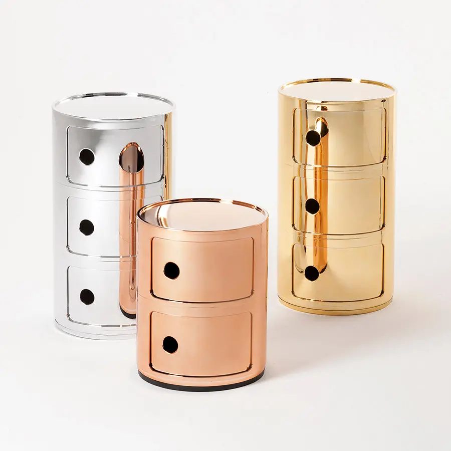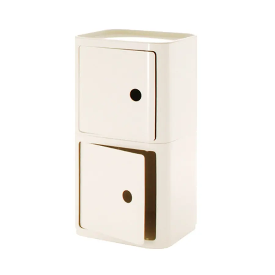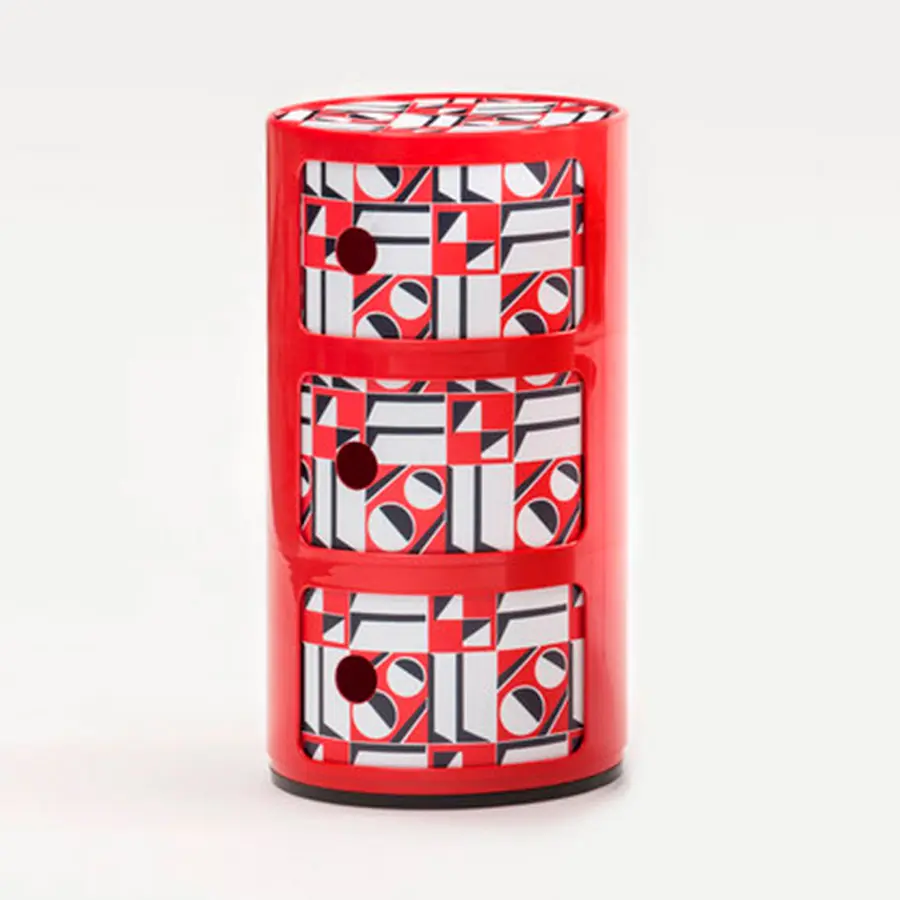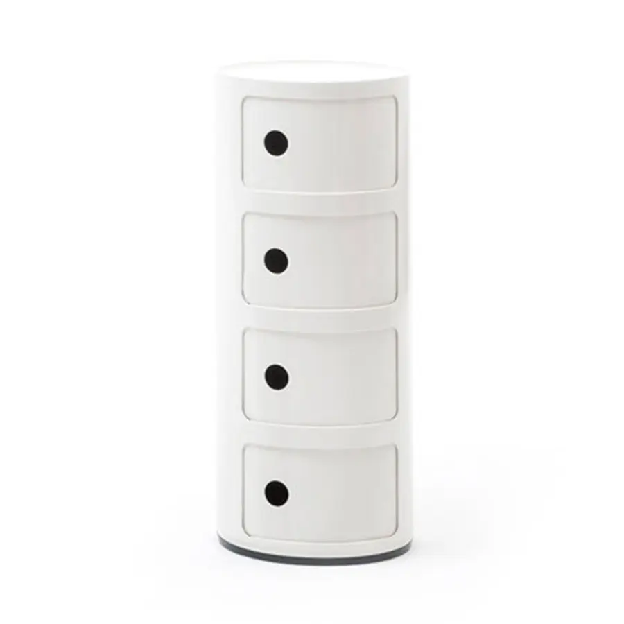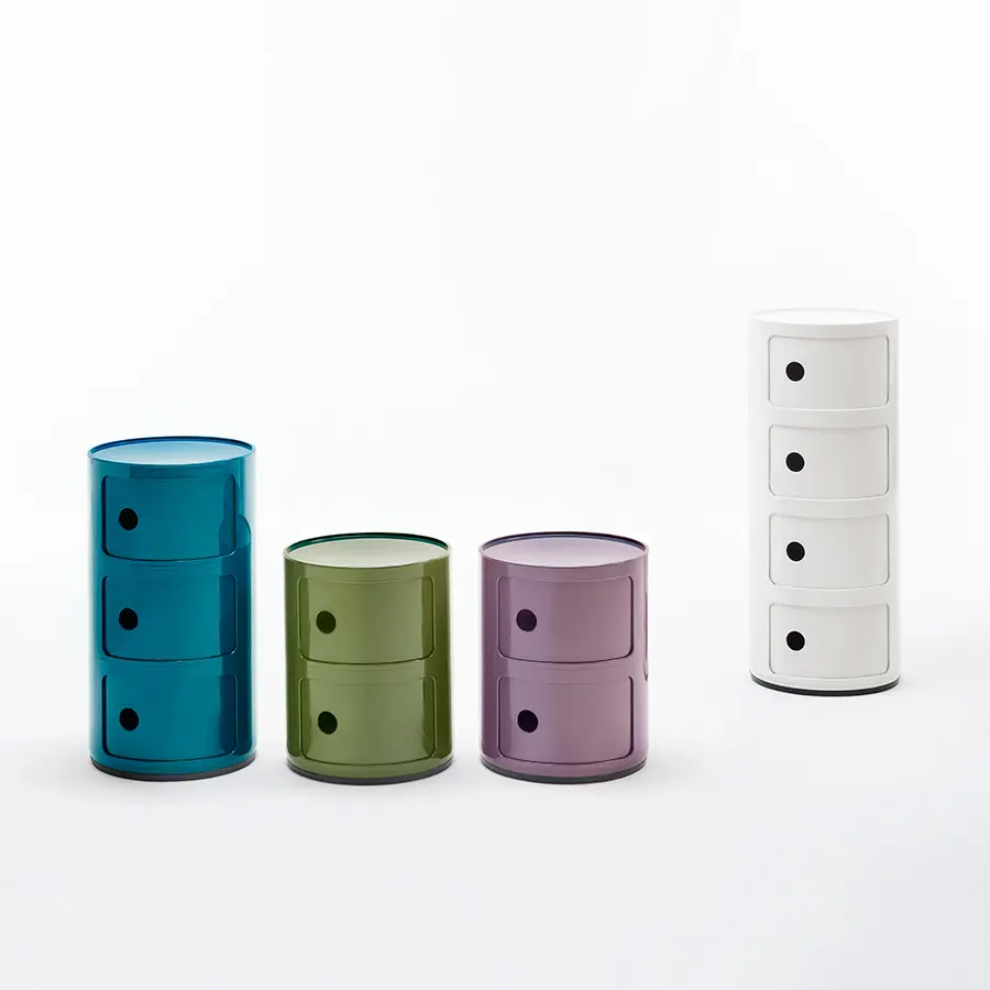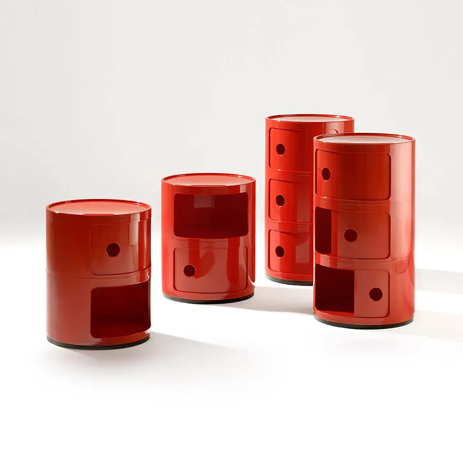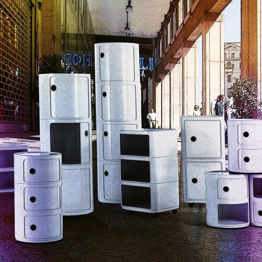 Los elementos modulares se han diseñado para satisfacer distintas exigencias de uso y ser utilizados en cualquier ambiente de la casa. La solución de diseño que da vida al sistema Componibili es la superposición vertical elemental y sólida de las piezas individuales, que simplemente encajándolas forman los prácticos muebles contenedores. Los Componibili están disponibles con forma redonda y cuadrada y pueden tener ruedas. Flexibles, funcionales y prácticos, los Componibili nacen en 1967 y son un clásico atemporal de la decoración.