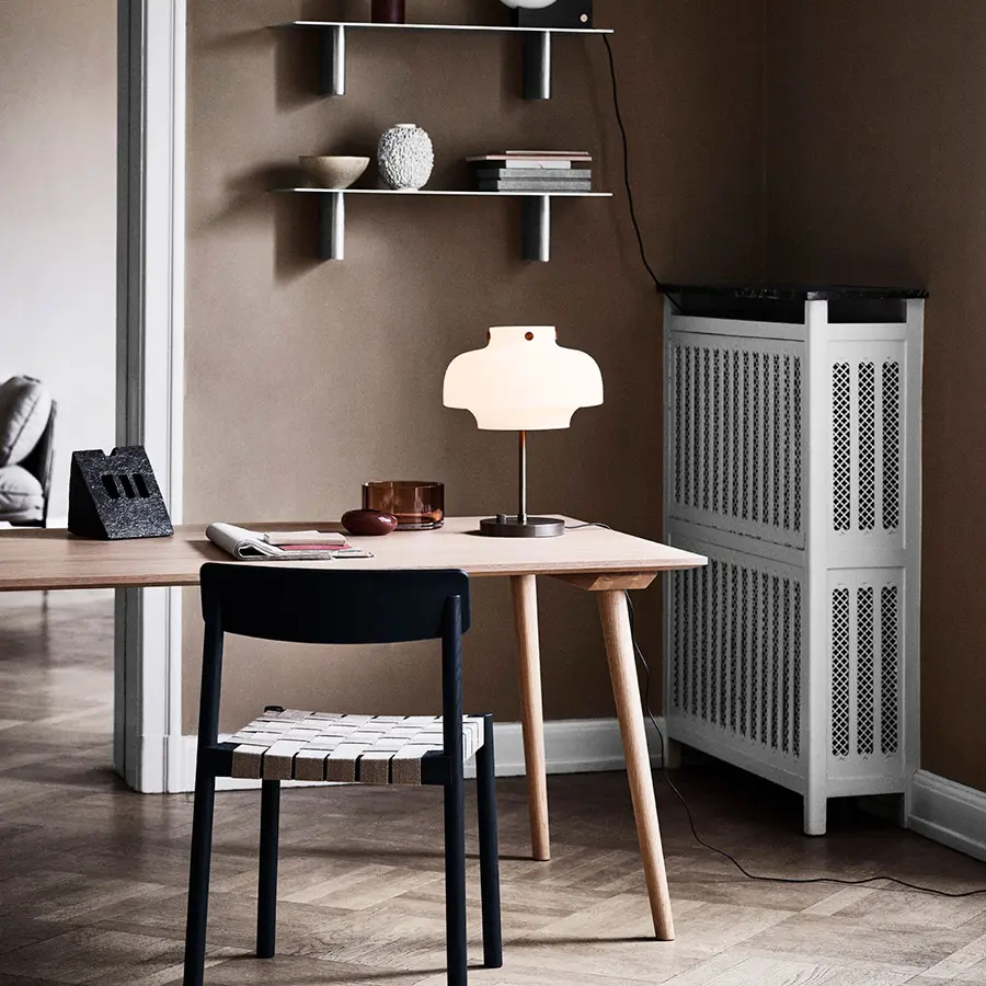 La ambición de Space Copenhagen era diseñar una lámpara con unn estilo industrial pero que sin embargo fuese simple, elegante y poética. Copenhagen es un ejercicio de contrastes. Combinando lo clásico y lo moderno, lo marítimo y lo industrial. La serie comenzó con una lámpara de suspensión en tres tamaños en 2014 y se extendió en 2018 con dos lámparas de mesa, una lámpara de pared y una lámpara de pie.