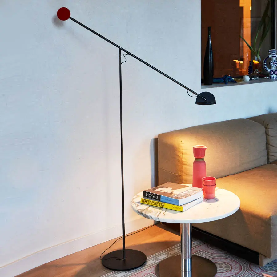 La colección se compone de una versión de escritorio y otra de pie que juegan con contrapesos al mezclar materiales de distinta densidad, como aluminio en el cabezal o acero en el extremo opuesto. Esta estructura permite mover la lámpara con gran precisión alcanzando alturas y distancias distintas para ajustar la posición y la dirección del haz de luz.