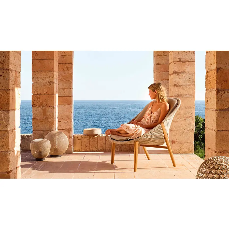 Esto requiere de una gran maestría, ya que, aunque las esquinas del tubo están dobladas a 90°, mantienen une forma redonda. El respaldo solo está unido a la estructura en dos puntos, por lo que parece estar flotando. El tejido con estructura abierta evoca la secular tradición del tejido.