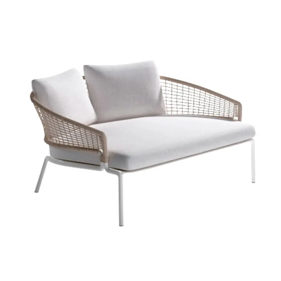 El respaldo solo está unido a la estructura en dos puntos, por lo que parece estar flotando. El tejido con estructura abierta evoca la secular tradición del tejido.
