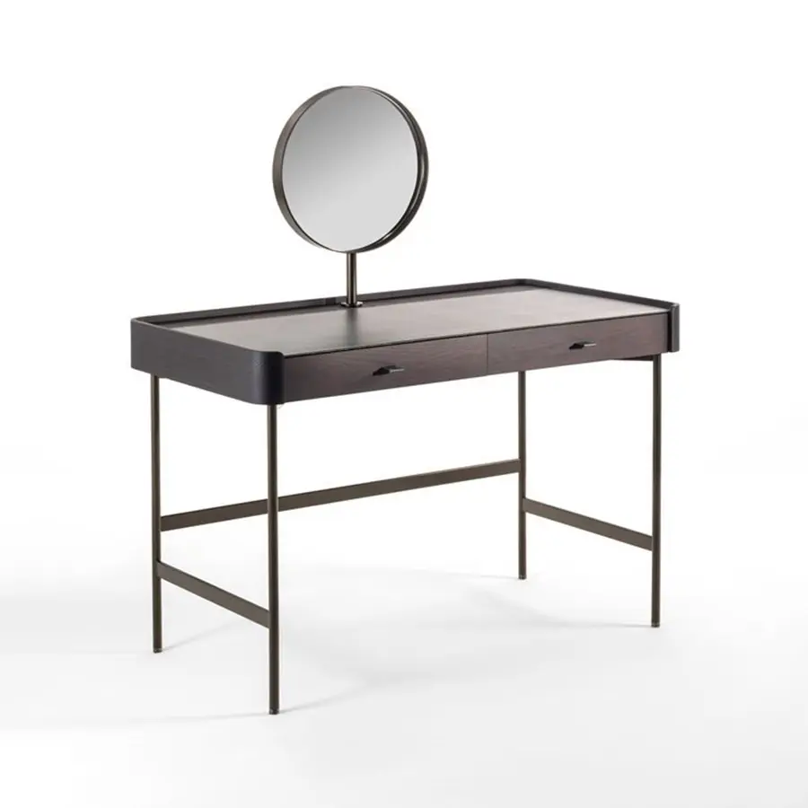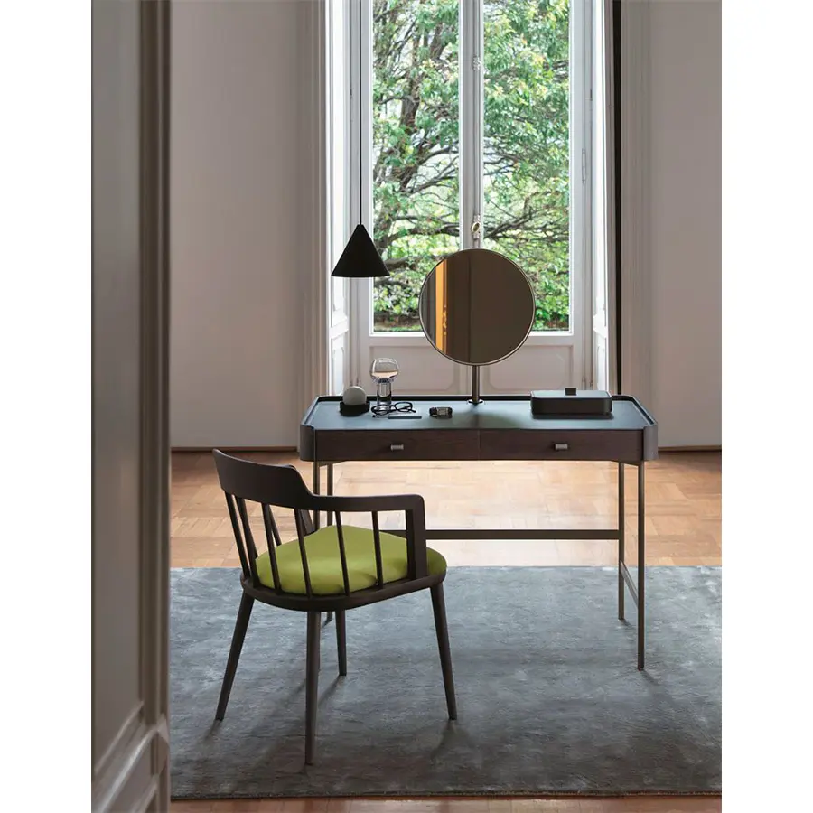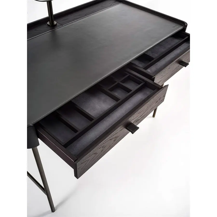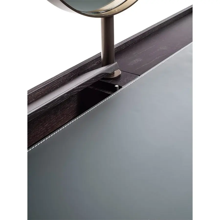 Tocador de fresno macizo con estructura de metal en acabado Bronzoro, tapa revestida de Cuoietto y dos cajones portaobjetos con manijas en Cuoietto y revestimiento interno en microfibra. Al final de la tapa están dos huecos pasacables con abertura push-pull. Es posible pedir opcionalmente el espejo, el taburetes y la cajas portaobjetos de la misma colección Dafto. 110x60x75