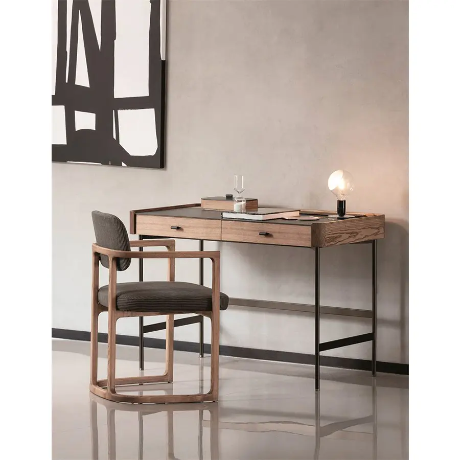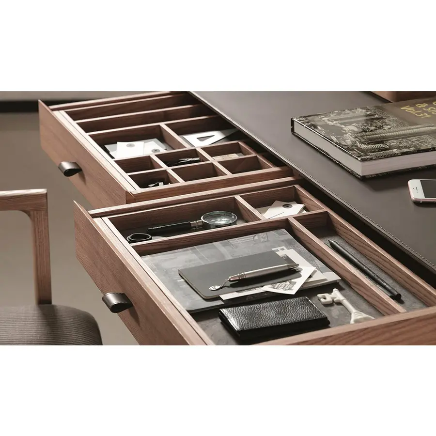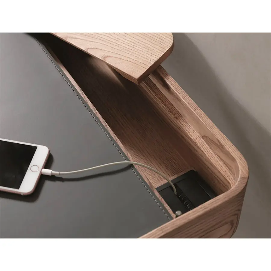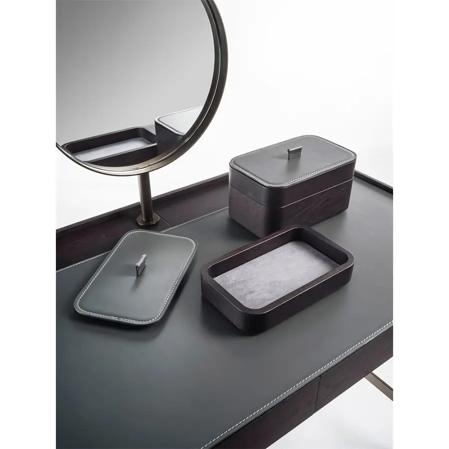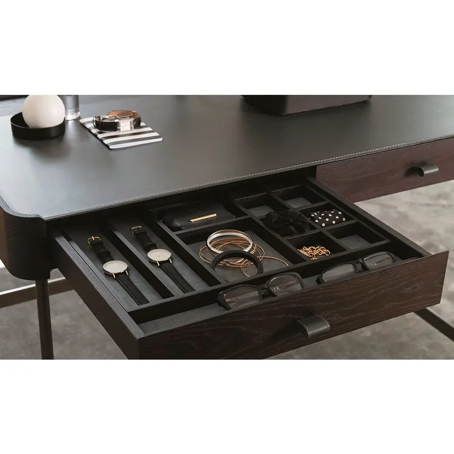 Tocador de fresno macizo con estructura de metal en acabado Bronzoro, tapa revestida de Cuoietto y dos cajones portaobjetos con manijas en Cuoietto y revestimiento interno en microfibra. Al final de la tapa están dos huecos pasacables con abertura push-pull. Es posible pedir opcionalmente el espejo, el taburetes y la cajas portaobjetos de la misma colección Dafto. 110x60x75