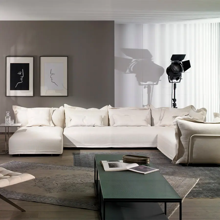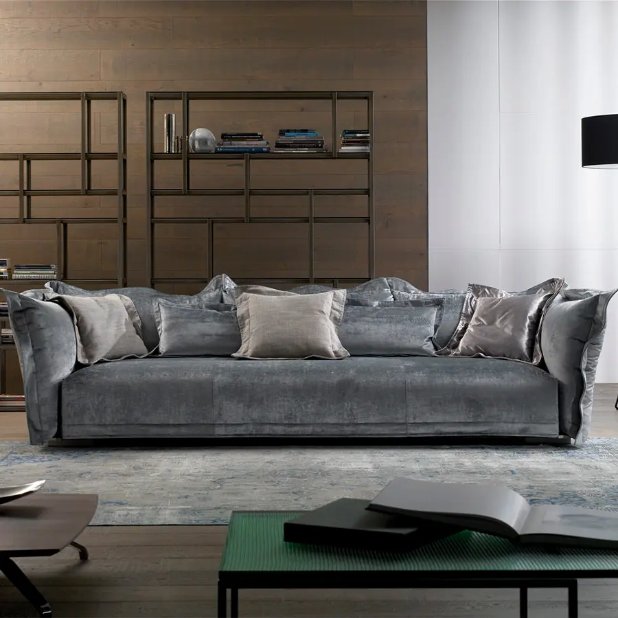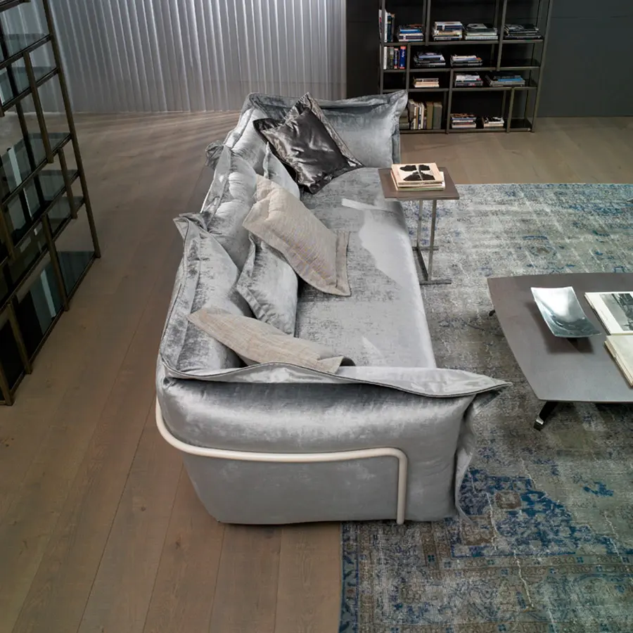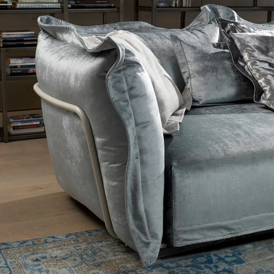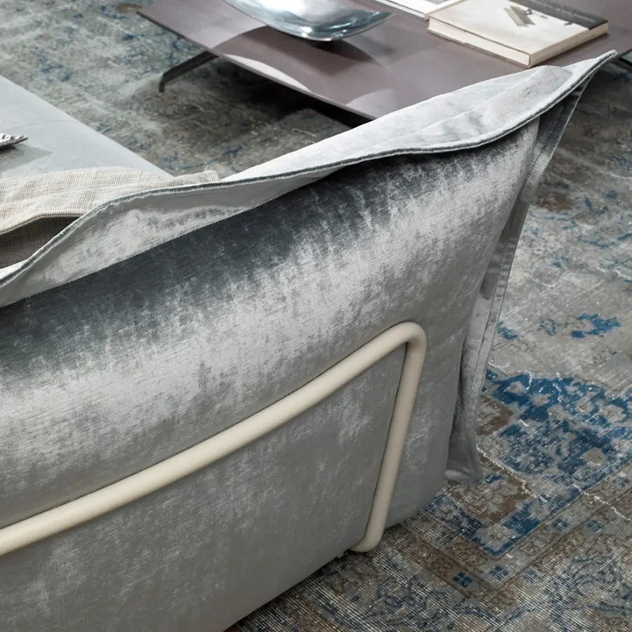 Dalí es extravagante, es distinto, es especial, es…. es simplemente genial! Dalí es Dalí. Un producto único en cuanto a riqueza visual y simplicidad conceptual. Sus formas sinuosas y los volantes de sus cojines lo definen como una pieza singular, destinada a ocupar su propio espacio en cualquier salón o hall. La colección consta de numerosas piezas que pueden combinarse entre si o funcionar por si solas como piezas únicas con identidad propia. Rellenos con fibra de poliéster hueca, pluma blanca de pato utilizada y plumón, con injerto de espuma de poliuretano de diversas densidades. Suspensión mediante cinchas elásticas. Totalmente desenfundable excepto cuando se tapiza en piel o imitación de la misma. Armazón metálico totalmente desmontable mediante tornillos.