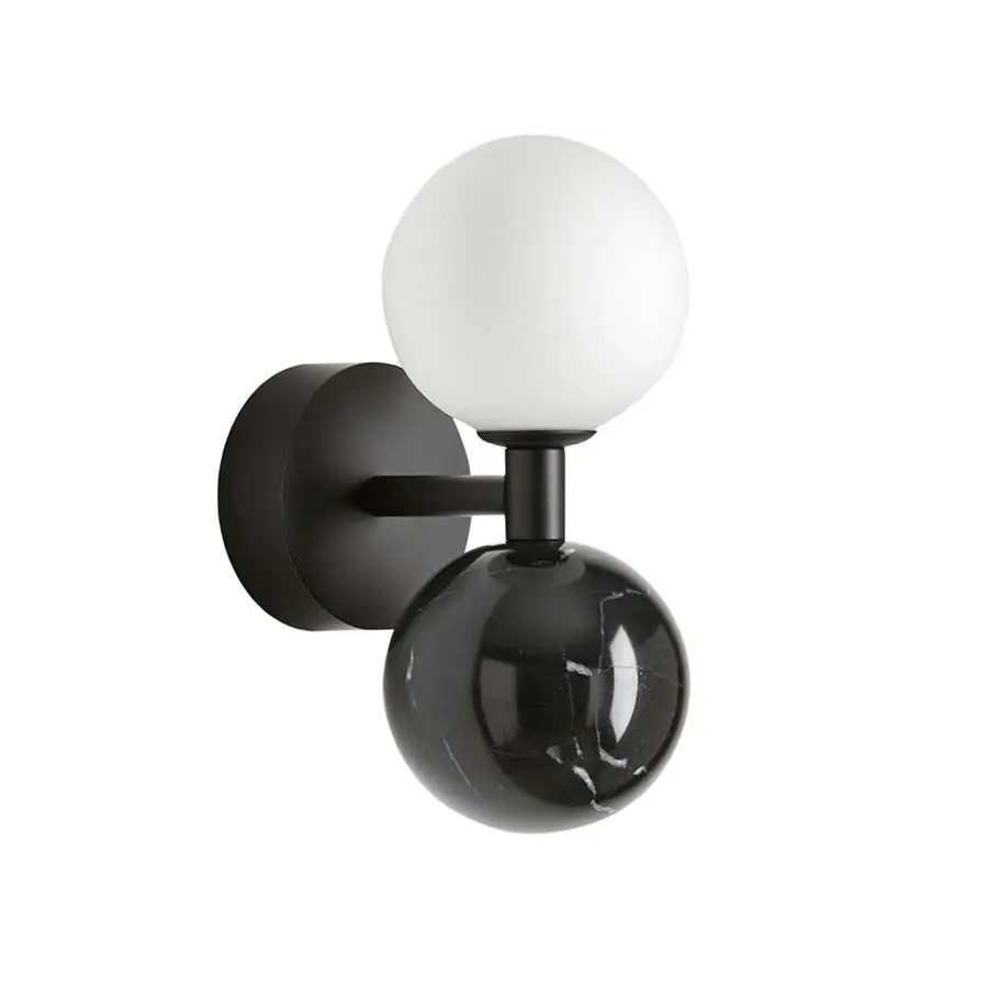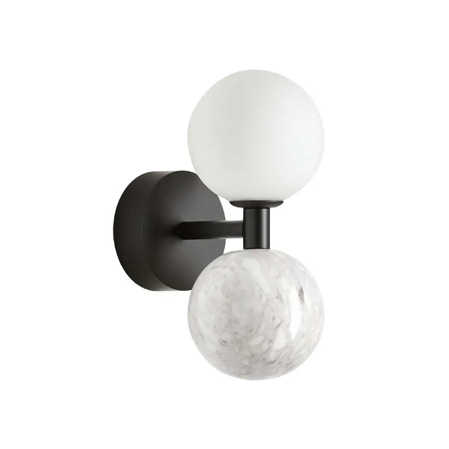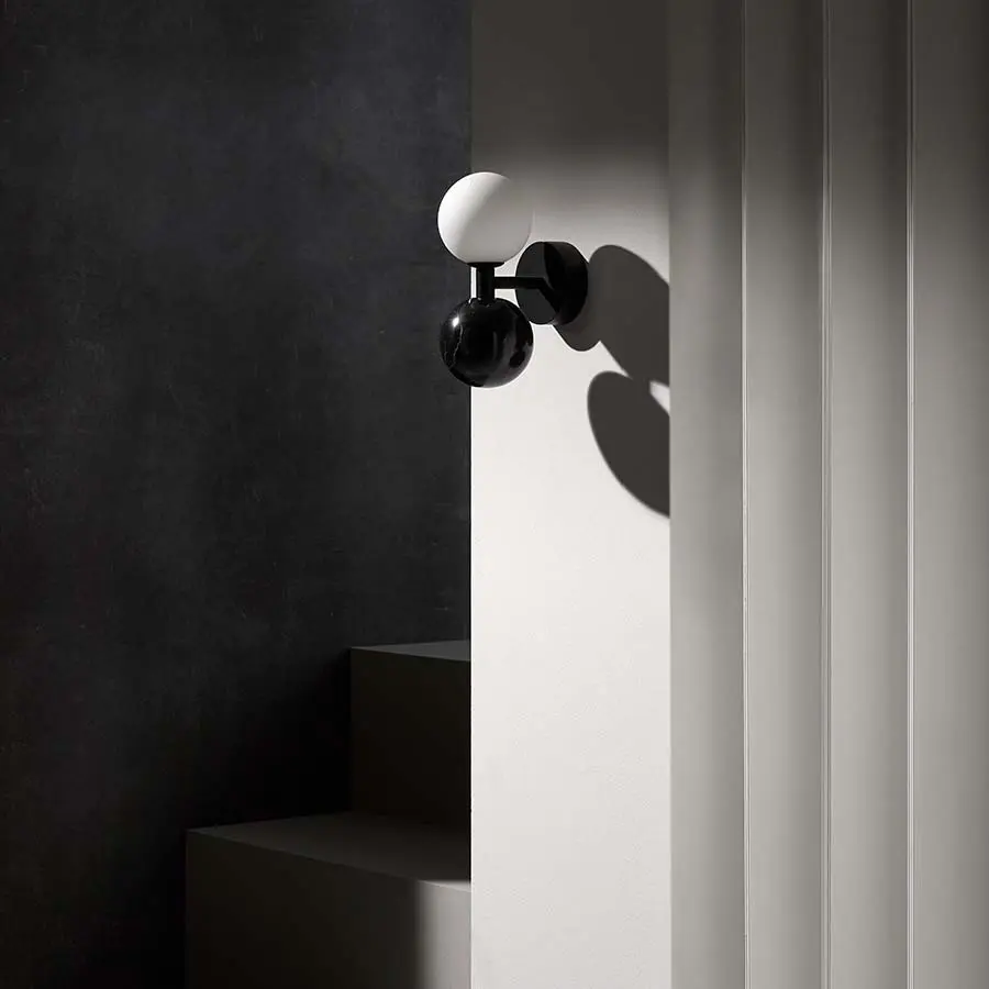 El aplique Dalt se caracteriza por una dualidad de materiales. La lámpara está compuesta por dos globos, la pantalla de cristal opal y una esfera de mármol pulido. La pura sencillez del cristal opalino se ve realzada por la suntuosa elegancia del mármol, acentuada por la estructura de metal. El marco tiene un acabado en negro mate o latón mate, que complementa perfectamente el color del mármol.