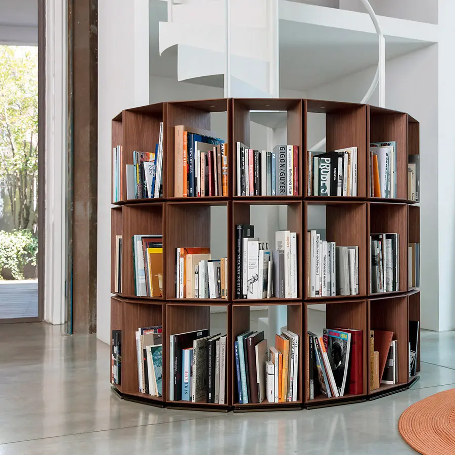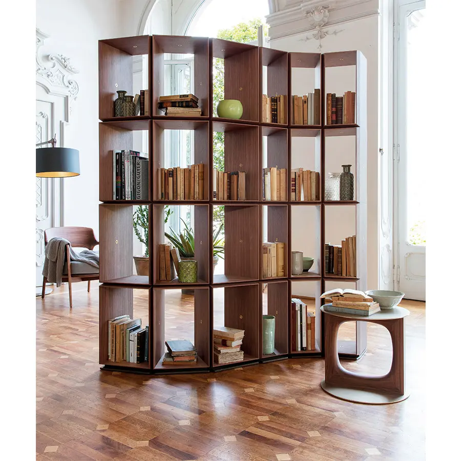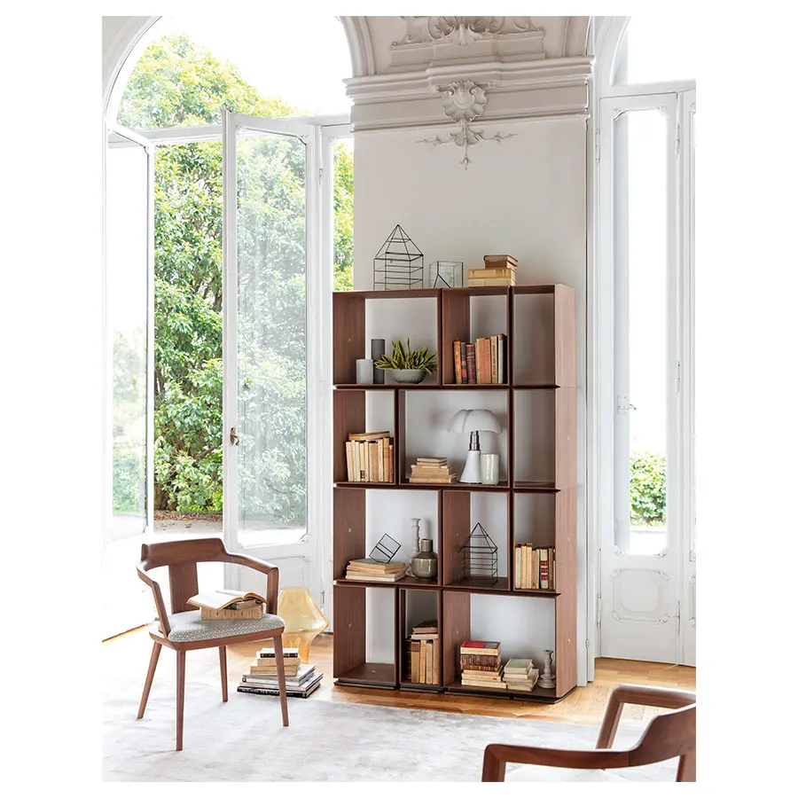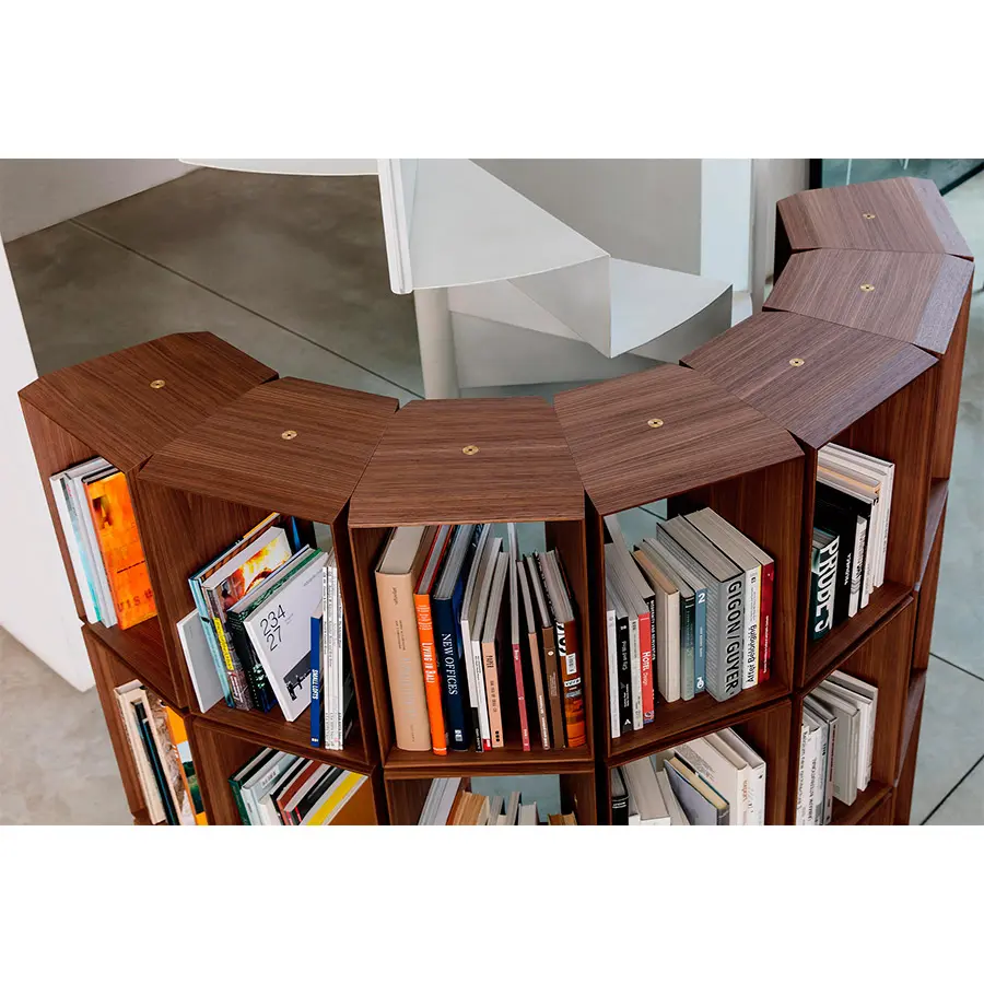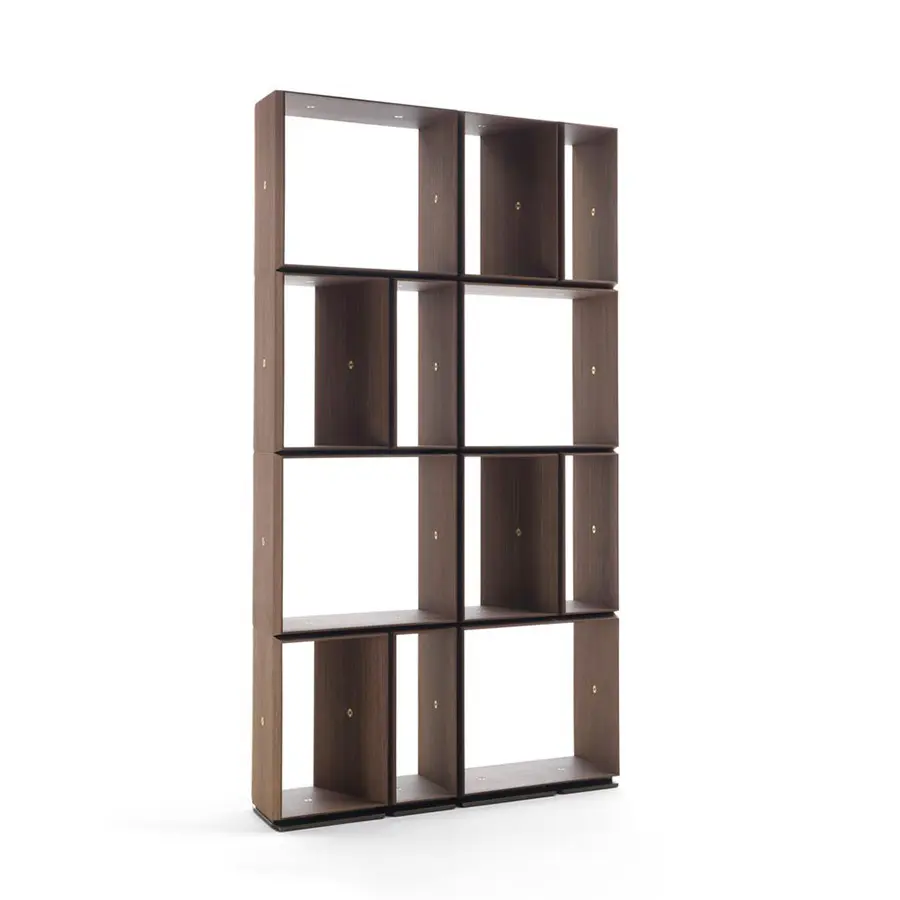 Estantería modular compuesta da dos contenedores de 32 cm y de 60 cm. Los contenedores en la base tienen contrapesos de metal. Encima de los elementos de la base se montan los diferentes contenedores, que se unen a través de junturas de latón cepillado curvado.