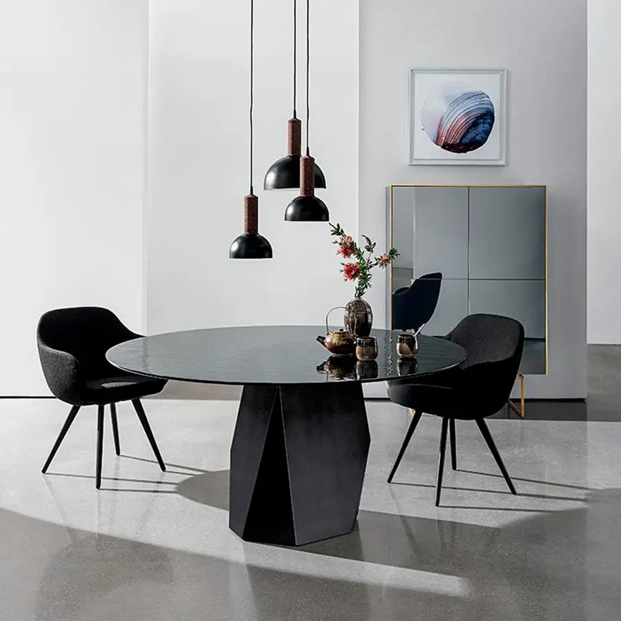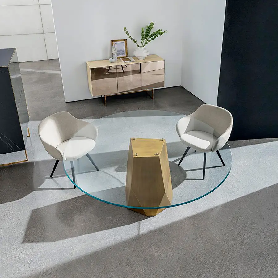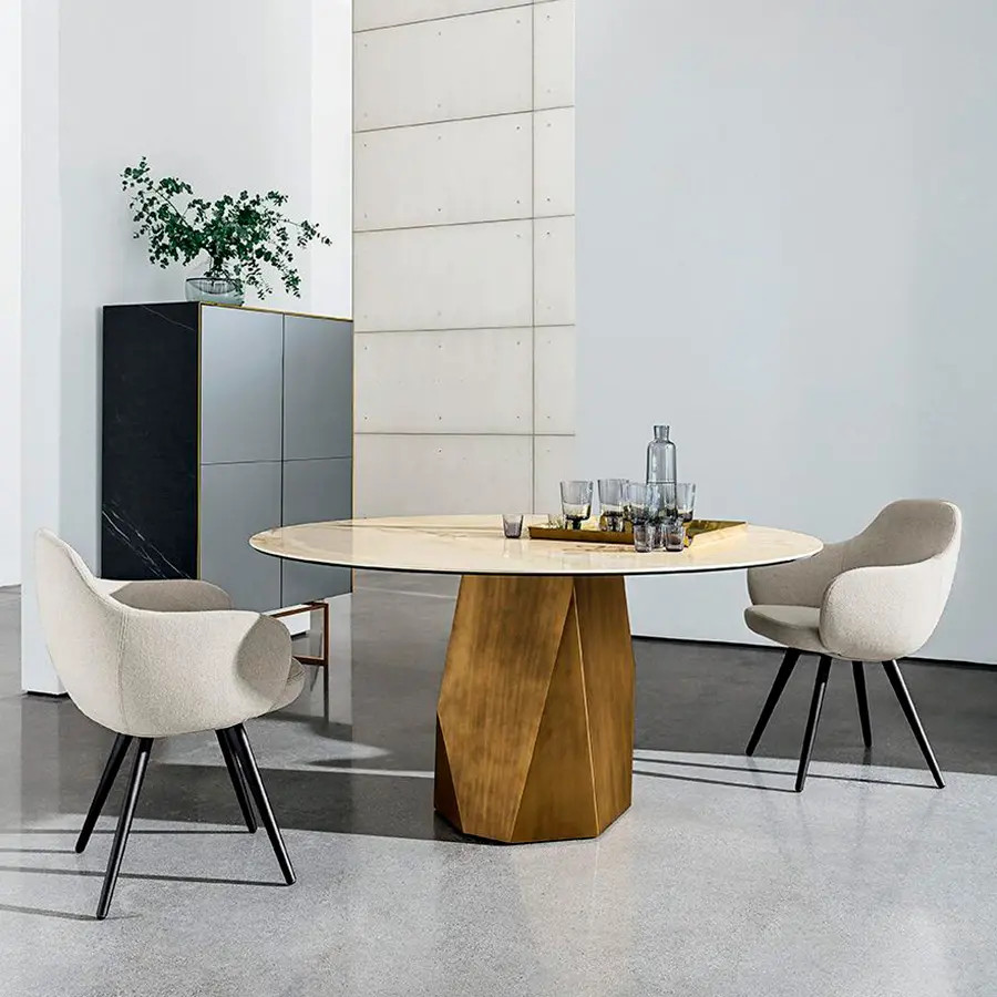 Una nueva mesa cuyas formas y materiales tienen un equilibrio natural de geometrías gracias a la base icónica inspirada en las líneas esculpidas de los Dolomitas. Mesa de comedor con base de metal en varios acabados. Encimera en cristal templado o madera laminada en diferentes medidas, materiales y acabados.