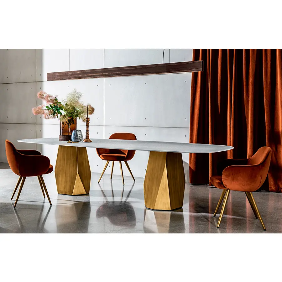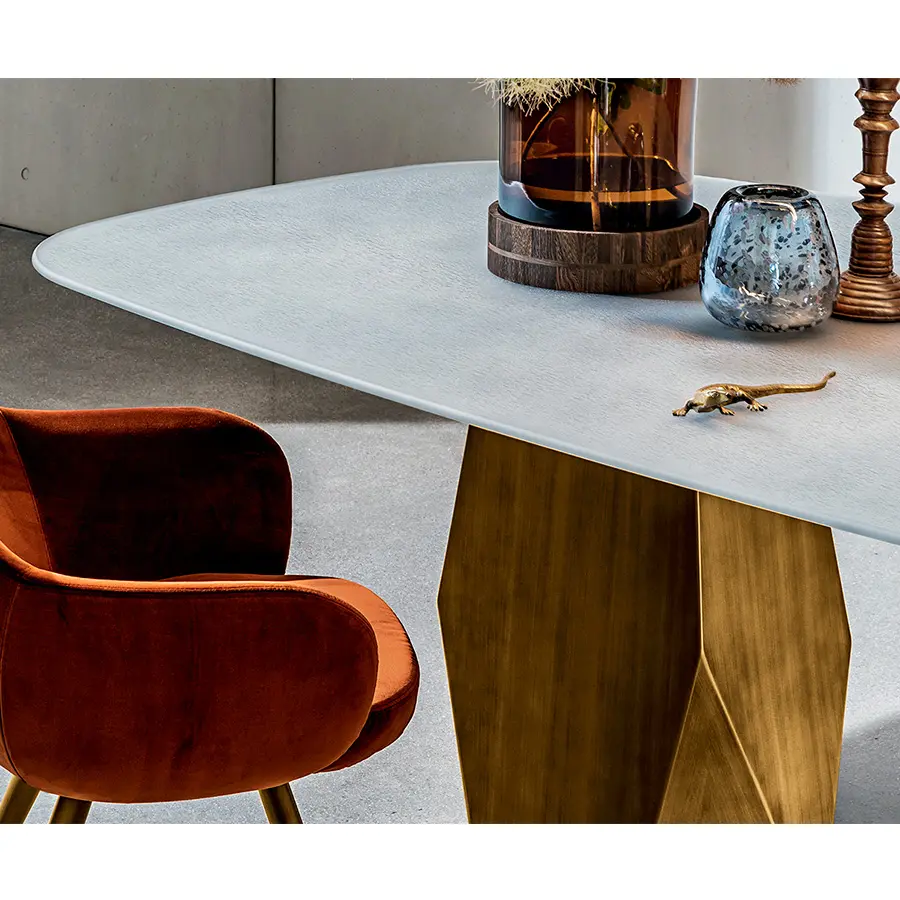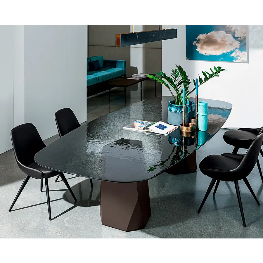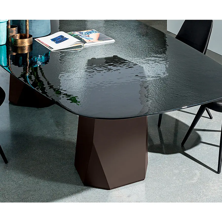 Una nueva mesa cuyas formas y materiales tienen un equilibrio natural de geometrías gracias a la icónica base inspirada en las líneas esculpidas de los Dolomitas. Mesa de comedor con base de metal en varios acabados. Encimera en vidrio templado o madera laminada en diferentes medidas, materiales y acabados.