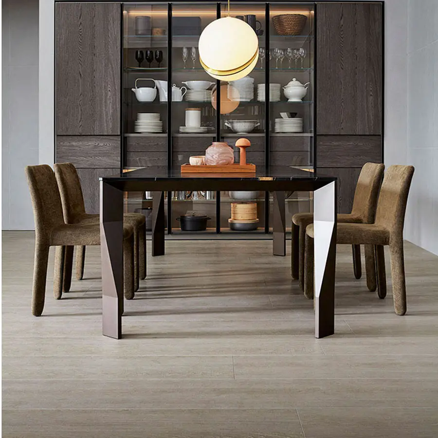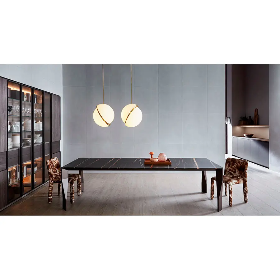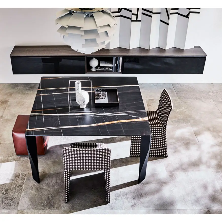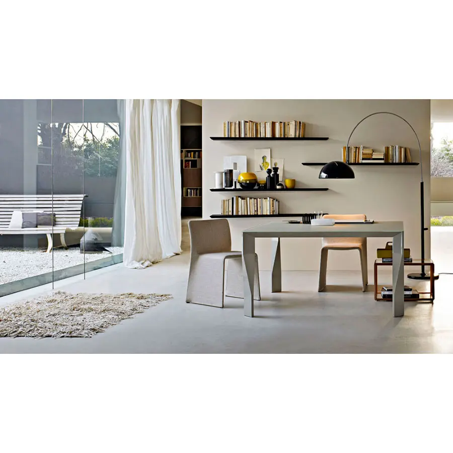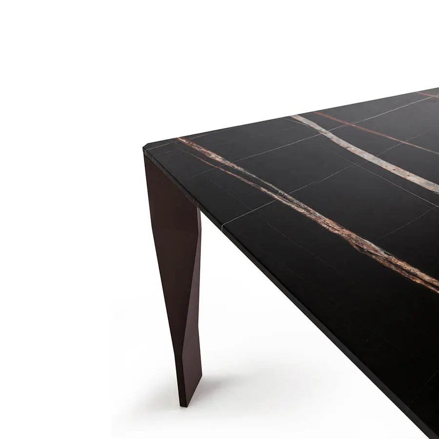 La serie de mesas Diamond se caracteriza por su pata doblada y envuelta en papel como un origami. Disponible en forma cuadrada y rectangular. Un elemento sabiamente compuesto por una lámina ligera de aluminio doblada y un interior compuesto por elementos de aluminio y poliuretano celular para dar solidez. Los sobres están disponibles en cristal o madera, a componer con estructuras de sostén de aluminio brillante o lacado brillante. Diamond ha ganado el Red dot design award Best of the best 2005.