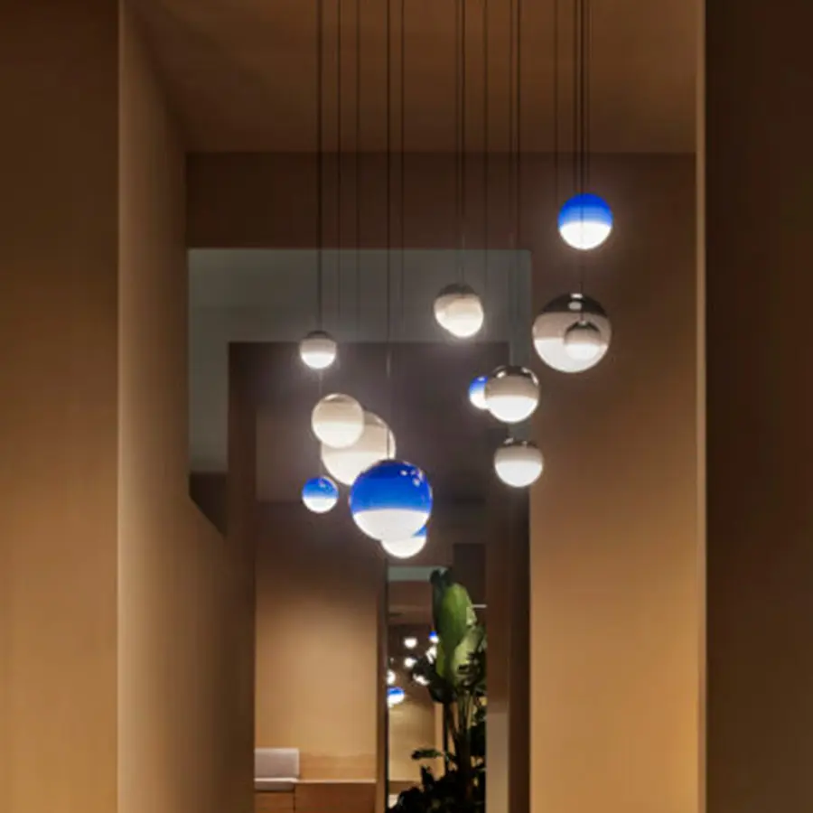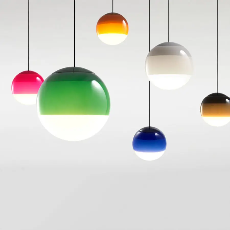 La nueva Dipping Light de suspensión se despoja de todo y se queda con lo esencial, el color se convierte en protagonista absoluto. Por eso al crear una composición con varias, el efecto visual es fascinante. Esta nueva modalidad se presenta en tres tamaños distintos: 12,5, 20 y 30 centímetros de diámetro.