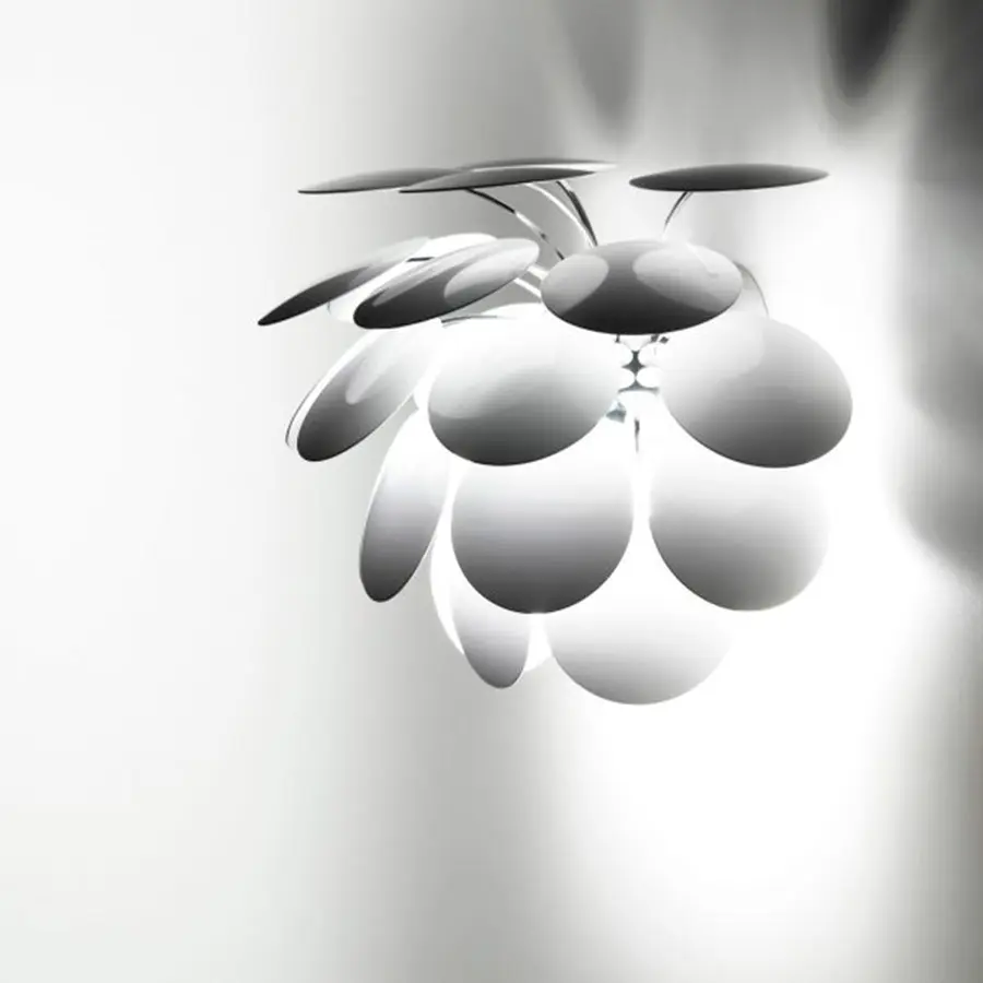 La semiesfera cromada del núcleo, donde se anclan los discos, aporta reflejos suplementarios. Apagada la lámpara preserva su atractiva presencia, sugiriendo esa expansión de energía que cobra todo el sentido al utilizarla.