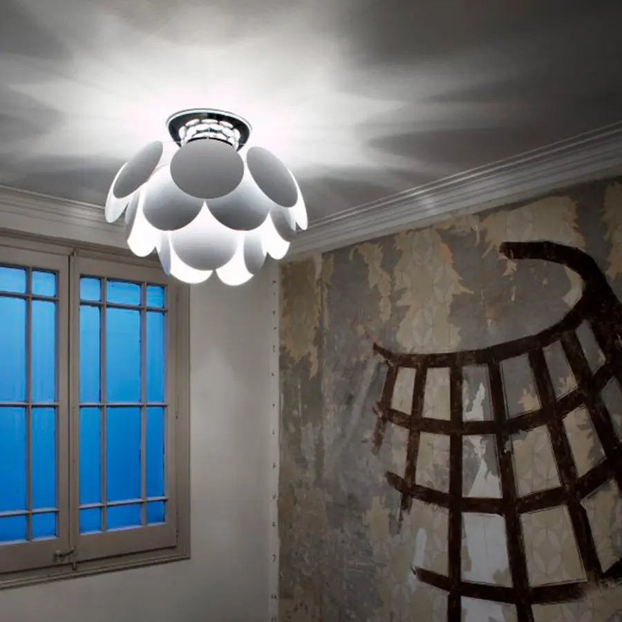 Exuberante, también cuando está apagada, la riqueza de luz que emite la lámpara Discocó procura una iluminación directa descendente y, al mismo tiempo, un efectista juego de luces y suaves sombreados.