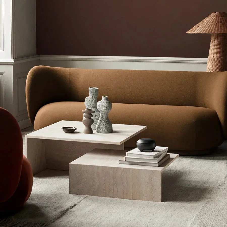 Con una estética inspirada en el minimalismo japonés, las mesas Grande Duo forman parte de la serie Distinct de ferm LIVING. Compuestas por dos mesas separadas que se unen para formar una pieza cohesiva, las mesas Distinct están hechas de lujosa piedra travertina y se pueden exhibir como una sola unidad o por separado.