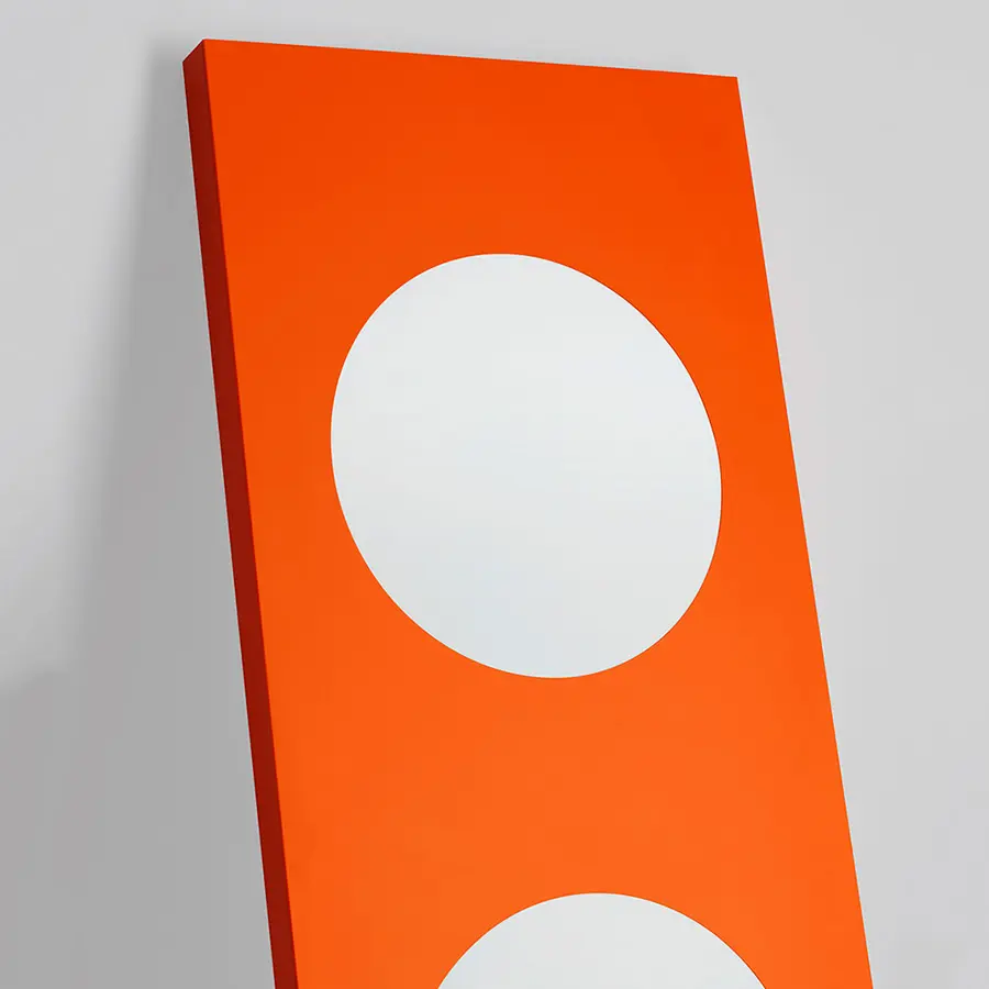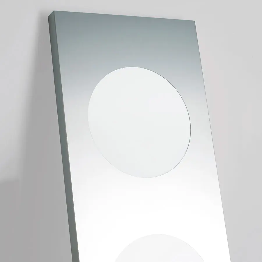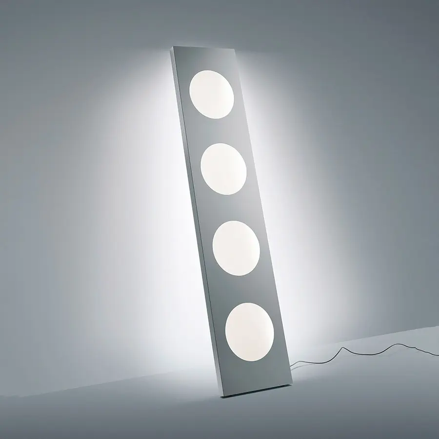 Lámpara de pie para instalar apoyada en la pared de luz difusa y reflejada. La lámpara está formada por una placa de aluminio cortada con láser, doblada con prensa de flexión y acabada a mano. El aluminio está anodizado y sucesivamente se barniza con líquido transparente o de color. Dispone de dos difusores en PMMA opalino. El frontal es ligeramente gofrado. Entre los dos difusores se ha colocado una placa, en PMMA transparente, que propaga la luz procedente de los LED multichip instalados en los lados largos de la estructura en aluminio. La placa está grabada con láser en las áreas que coinciden con los ojos de buey para concentrar el reflejo de la luz. Dispone de cable eléctrico y regulador de luz transparente para el anclaje obligatorio a la pared. Se entrega de serie un pequeño soporte .