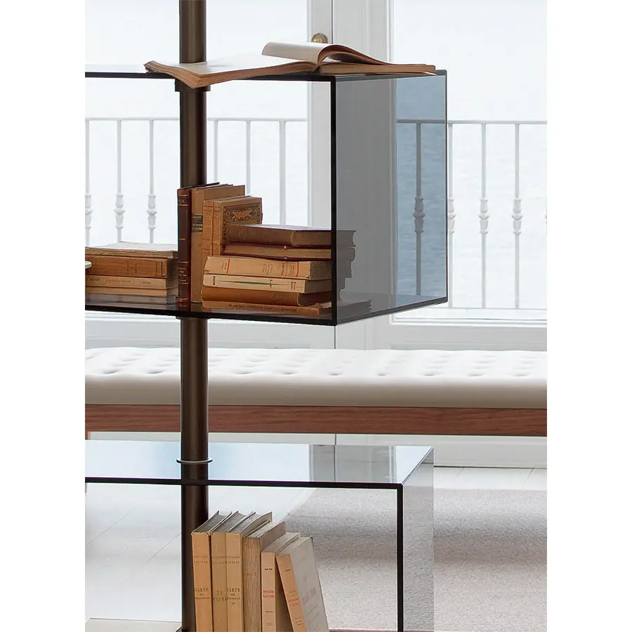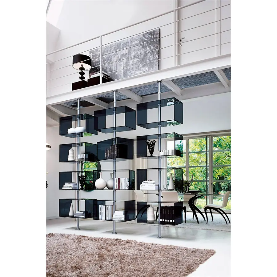 Sistema constituido por columnas de metal fijadas entre suelo y techo o a la pared. Es posible personalizar la composición con contenedores de cristal posicionables a diferentes alturas.