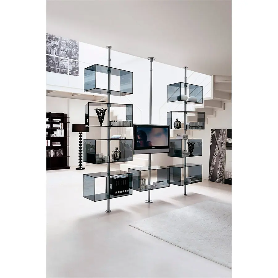 Porta TV compuesto de una columna de metal fijada a la pared o al techo con 8 agujeros pasacables y con placa para fijar el TV. Es posible personalizar la composición con contenedores de cristal o baldas de madera.