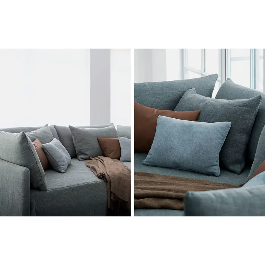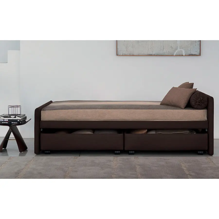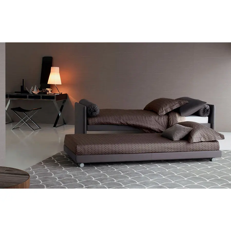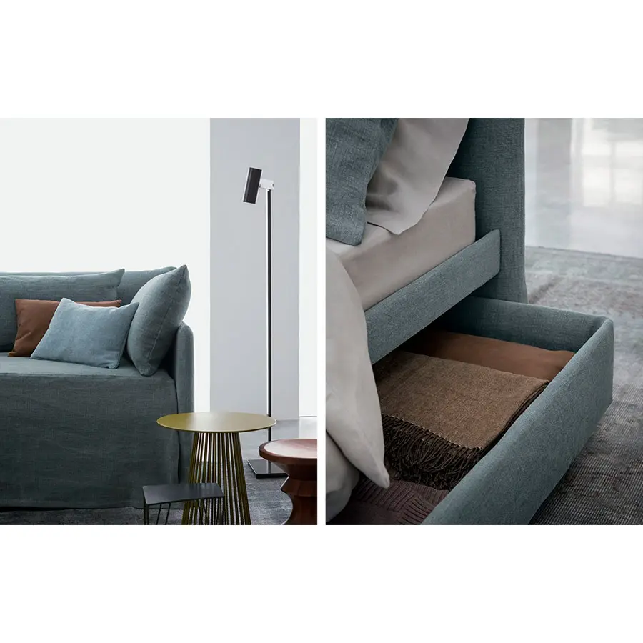 Cama transformable de diseño simple y elegante. Estructura forrada en tejido, piel o Ecopelle, completamente desenfundables. Disponible, con somier de lamas fijas. Cama individual, se convierte fácilmente en una cama matrimonial añadiendo la segunda cama extraible que se eleva gracias a los prácticos pistones a gas y se puede anclar a la primera gracias a dos bloques de acero y goma. Compuesto de funda de asiento, fundas porta almohada y rulos, puede ser personalizado añadiendo el respaldo. Desde el 2014 está disponible también la versión ‘shabby chic’ del revestimiento, con cojines modulados que le añaden confort al asiento cuando se utilize como cama o sofá.
