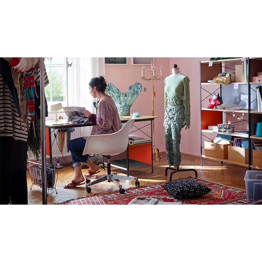En 1949, Charles y Ray Eames diseñaron un innovador sistema de estanterías y escritorios independientes y multifuncionales. Al igual que la Eames House, construida en la misma época, estos diseños cumplían los principios de la producción industrial: hablamos de la Eames Storage Units (ESU) y la Eames Desk Unit (EDU). Los paneles funcionan como una discreta pantalla y cierran parcialmente los dos compartimentos de almacenamiento. La mesa es de altura ajustable para adaptarse a suelos irregulares.