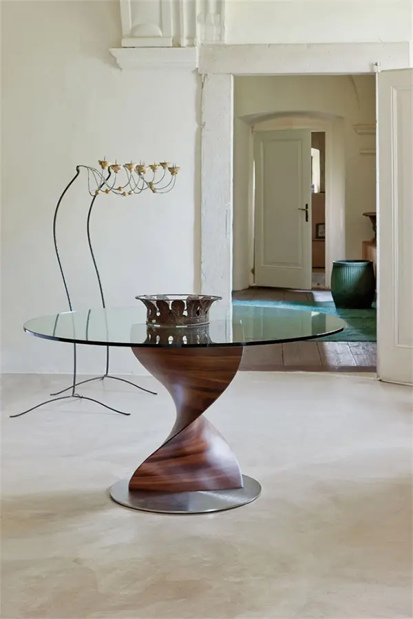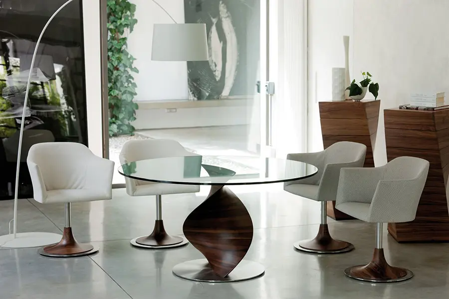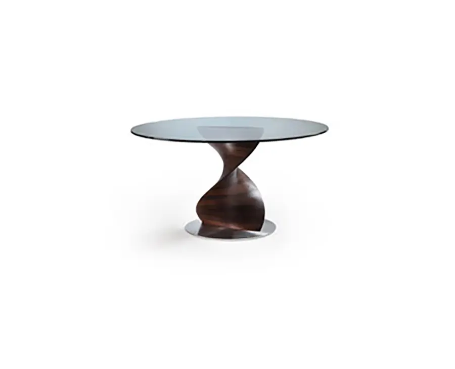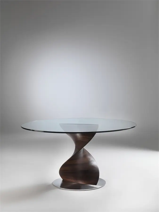 Mesa de comedor con base de tecnopolímero, o nogal canaletta o fresno macizo montada sobre de un disco de metal y tapa de cristal templado (espesor mm. 12). Posibilidad de redonda en diferentes medidas, elíptica con una base de 180×110, elíptica con dos bases en diferentes medidas comprendidas entre dos metros y tres metros y medio. También posibilidad en ovalada o rectangular de dos bases.