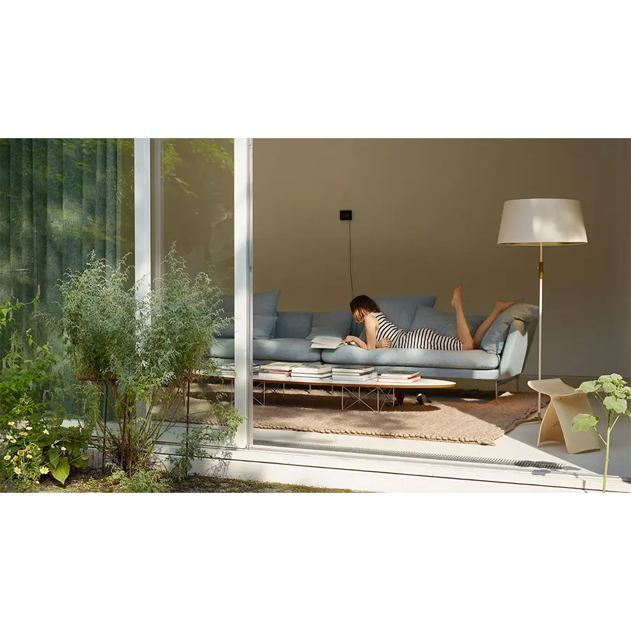 La expansiva y elegante mesa de centro ETR deCharles y Ray Eames se ofrece con tablero negro o blanco y una base metálica cromada o revestida en polvo de color negro. Por su forma elíptica, enseguida recibió el nombre de «surfboard table».