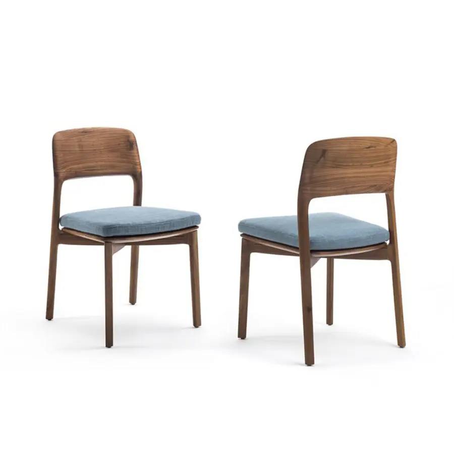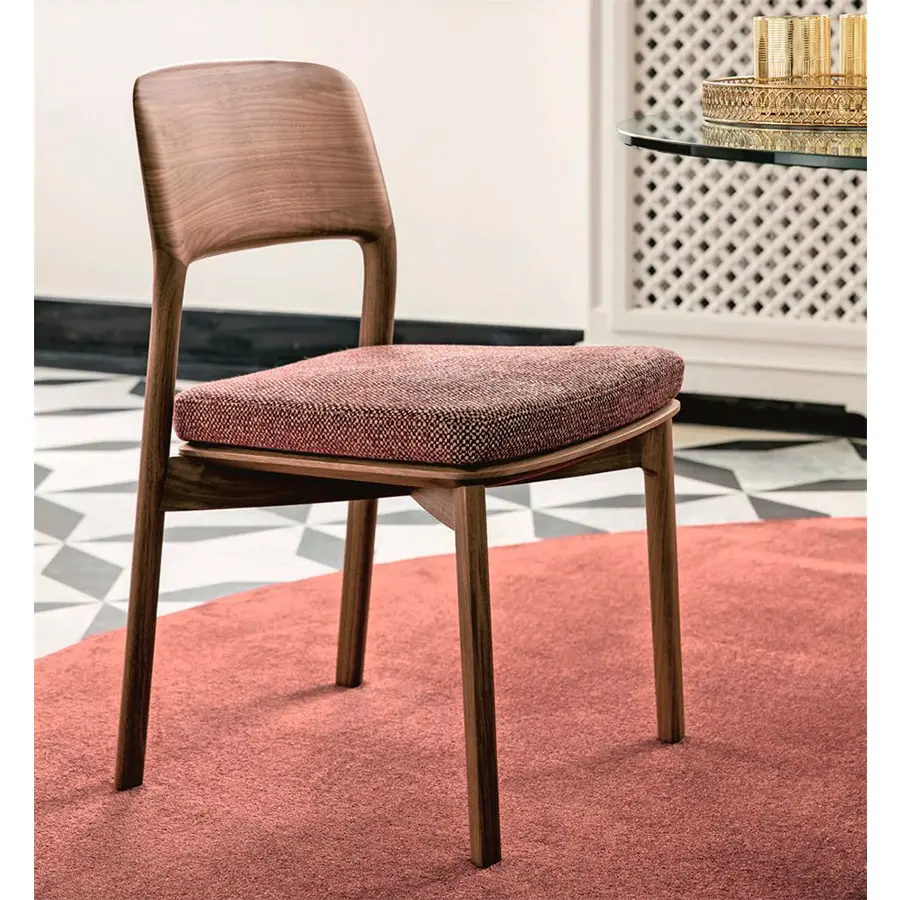 Silla con estructura de nogal canaletta macizo. Asiento de nogal canaletta maciazo con relleno en goma de densidad diferenciada con soporte interno de contrachapado revestido en las telas de la colección. Con pies de nylon.