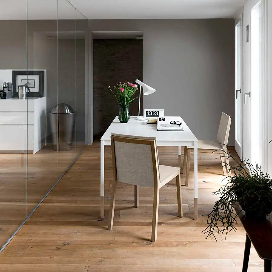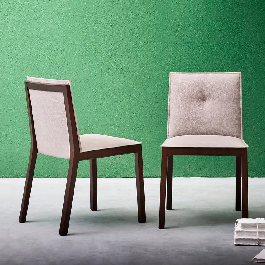 Esedra es una silla con estructura de madera maciza y asiento y respaldo tapizados. La forma regular de su estructura sostiene unos paneles tapizados de muy poco grosor pero cómodos.
