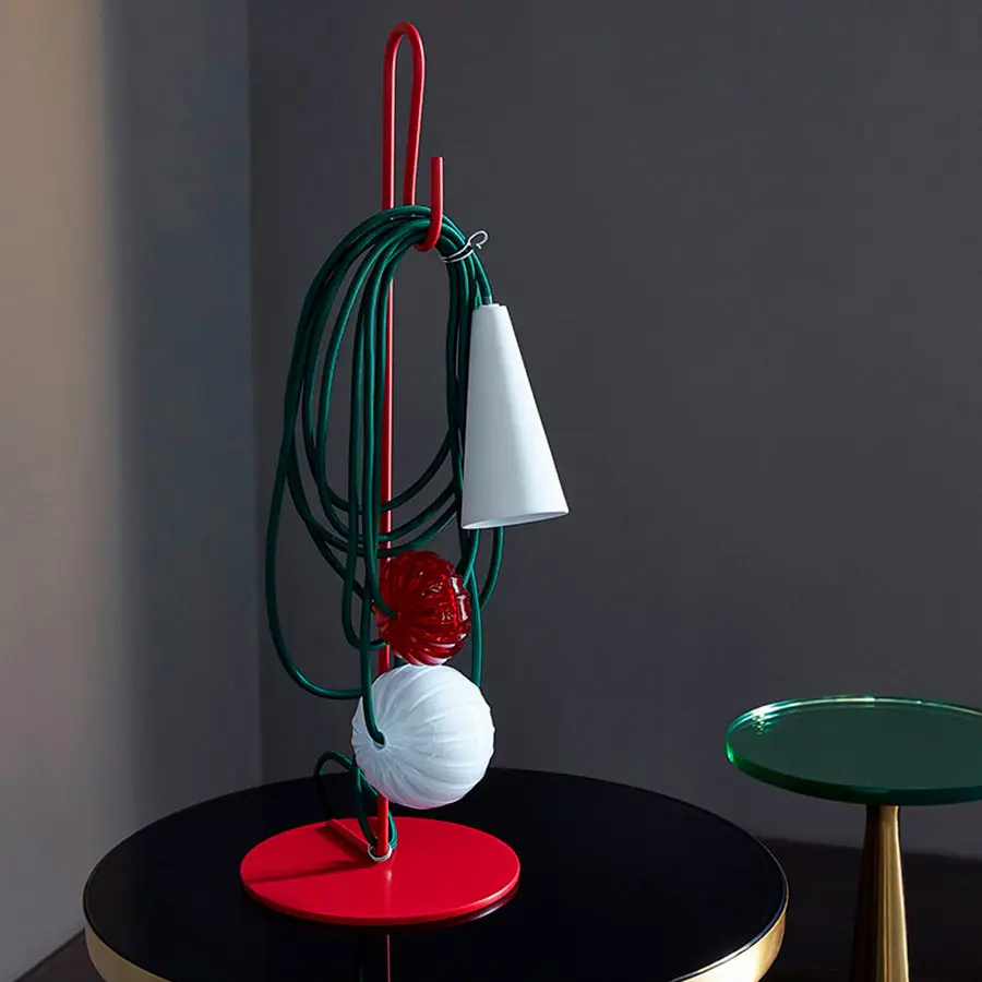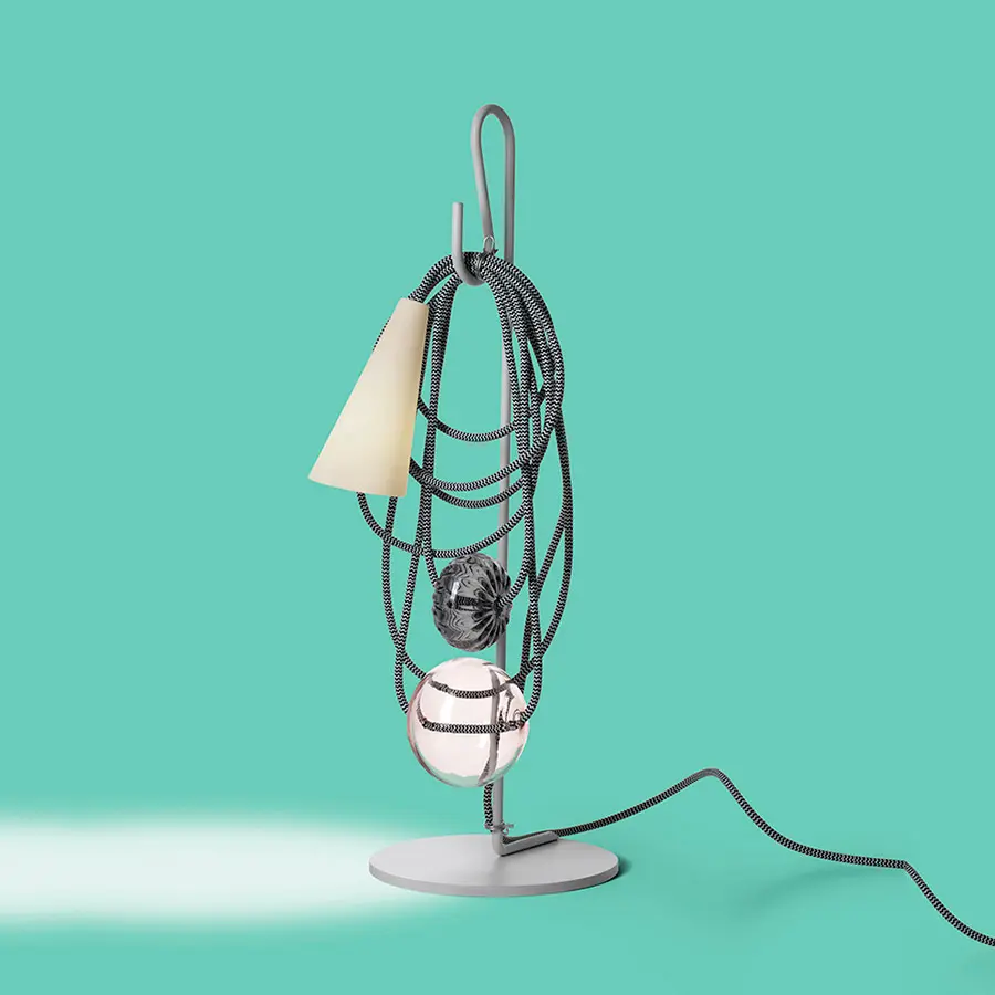 Filo nace del deseo de resaltar las distintas partes que componen una lámpara -fuente luminosa, decoración y cable eléctrico – articulando las características estructurales y estéticas, simplificando gramática y sintaxis. Su esencialidad es fruto de la decisión de utilizar la decoración para amalgamar, incorporando elementos que tradicionalmente no la contemplan. Ahora el cable eléctrico dialoga con los elementos de vidrio y con el difusor luminoso, en un juego ritmado de intercambios de papel. Si a lo largo del cable corre la energía que permite a la lámpara llevar a cabo su función iluminante, el cable pasa también a través de esferas y bolas de vidrio, transformándolo en el arquetipo de un collar, con un cuerpo de porcelana en forma de cono, que proyecta la luz sobre el cable y sobre las esferas de vidrio, colocándose idealmente como su pendiente. Un ábaco generoso de colores anima la lámpara con múltiples identidades, de los tonos de acuarela y las transparencias del vidrio de Murano, a las policromías encendidas de sabor étnico, hasta los tonos fluorescentes de los paisajes urbanos contemporáneos, permitiéndole integrarse en los ambientes más variados.
