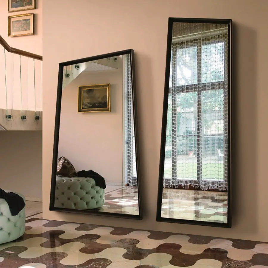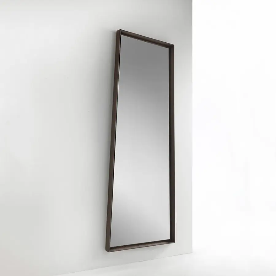 Espejo trapezoidal para colgar o apoyar a la pared con estructura en fresno macizo.