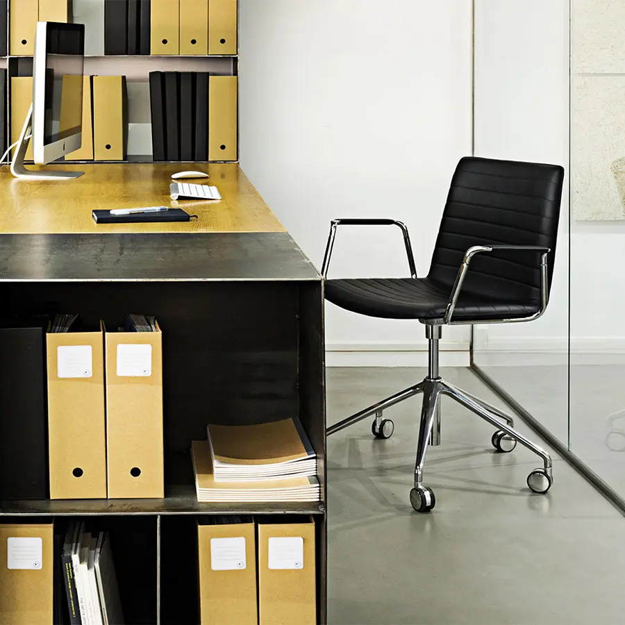 Sillón con carcasa de termopolímero disponible en varios colores y base central giratoria de aluminio con 4 o 5 ruedas, fija o regulable en altura y acabado aluminio pulido. Opción de carcasa tapizada con posibilidad de tapizado con costuras paralelas. Opción de brazos tapizados. Dos opciones de respaldo, una de ellas ligeramente más alta para mejorar la sensación de confort.Opción de brazos tapizados.