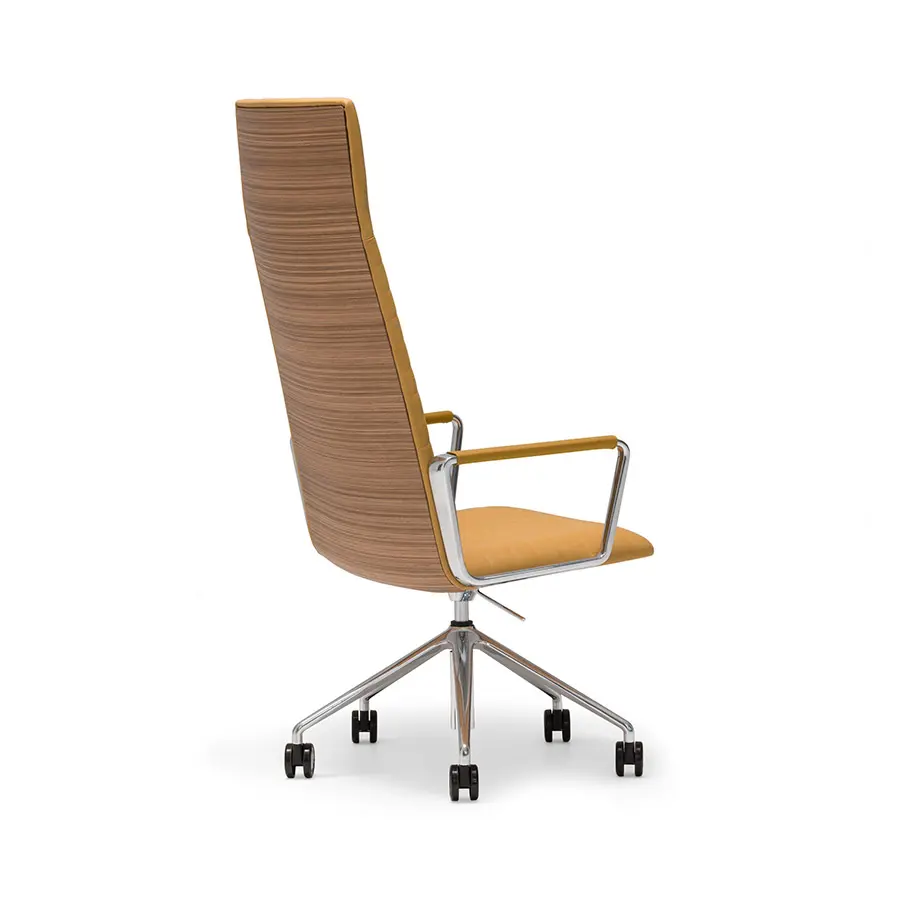 Sillón de respaldo alto con carcasa tapizada y base central giratoria con 5 ruedas regulable en altura en acabado aluminio pulido, blanco o negro. Opción de tapizado con costuras paralelas. Opción de sistema basculante. Opción de brazos tapizados.