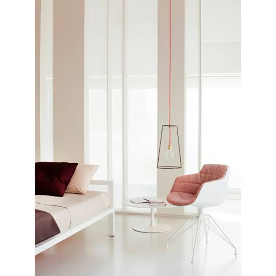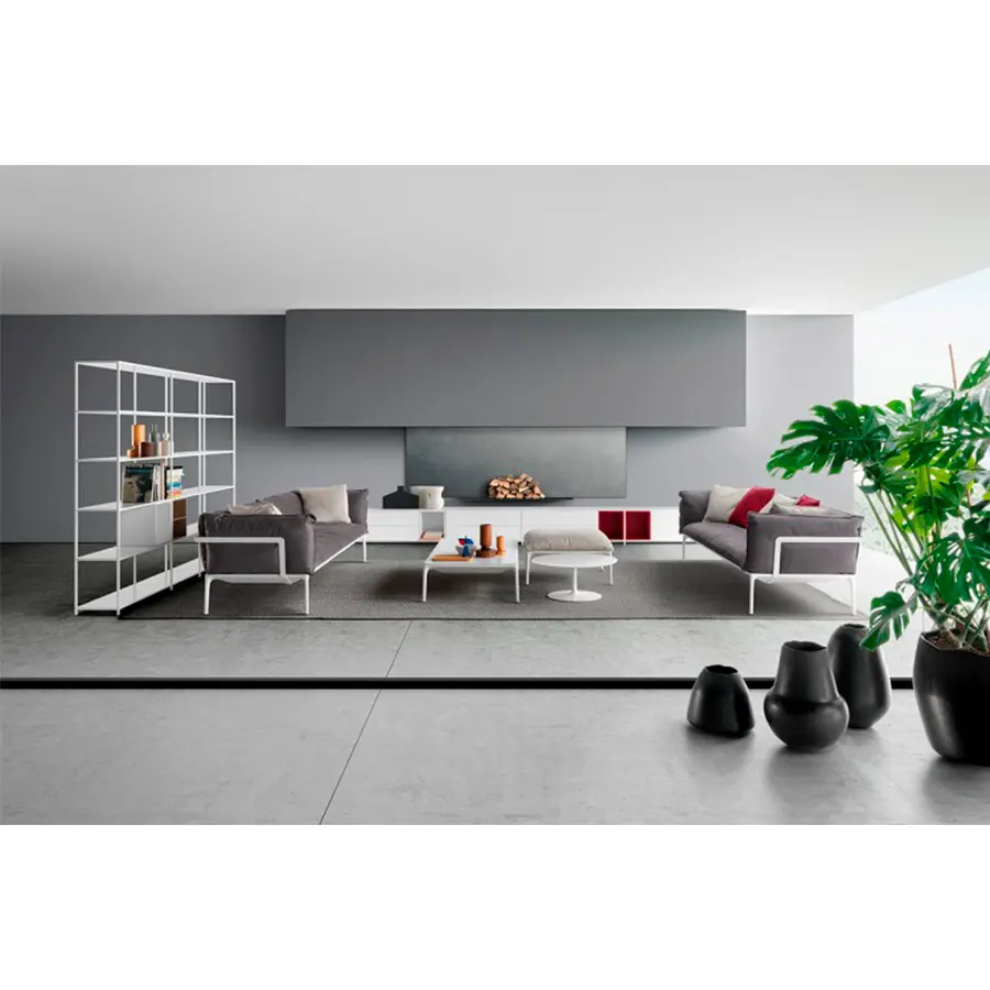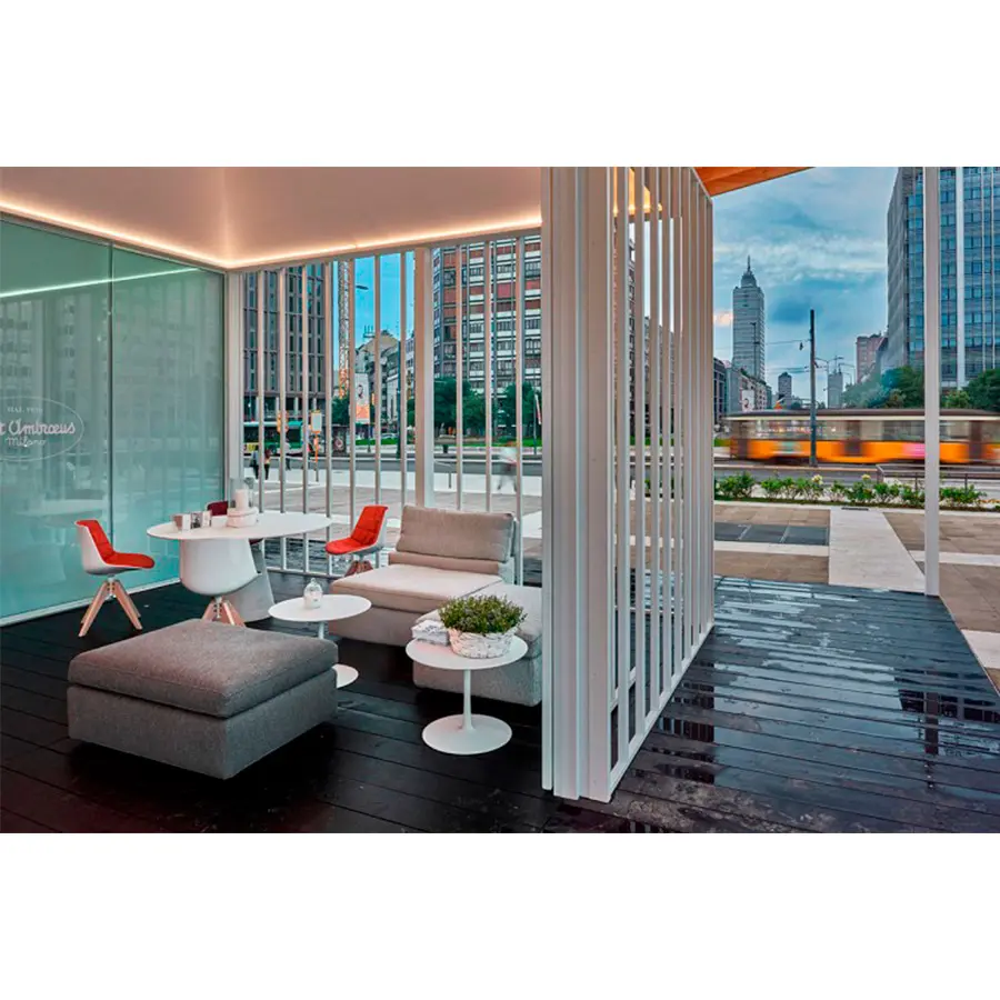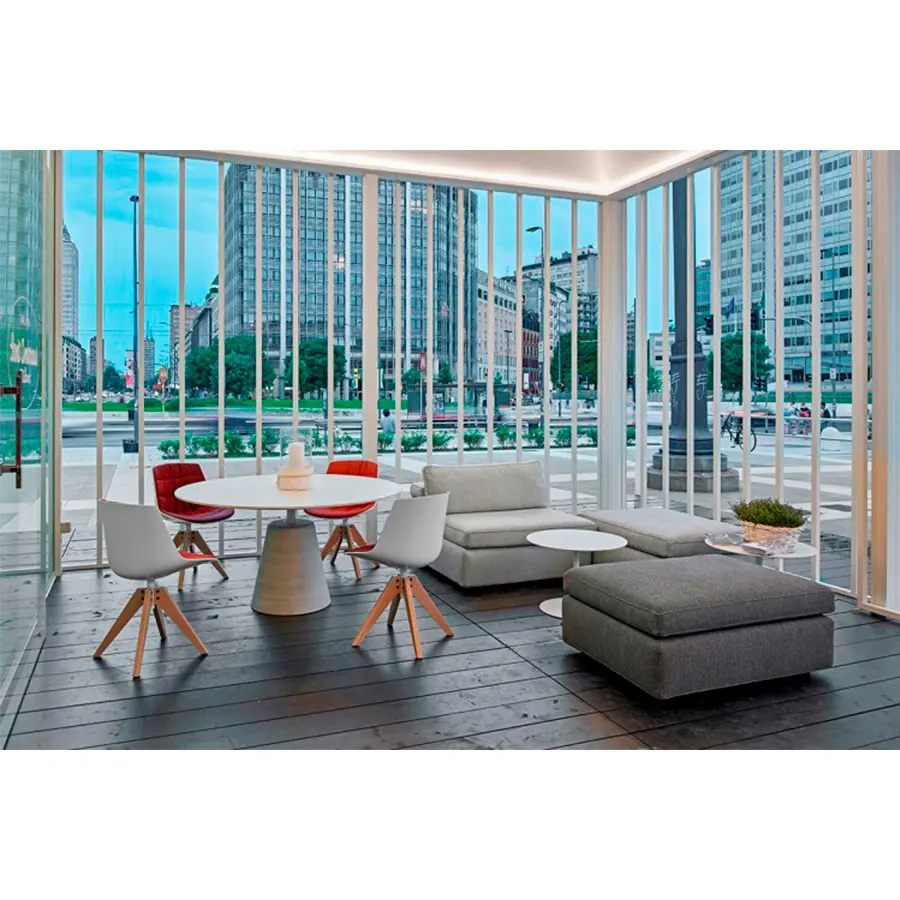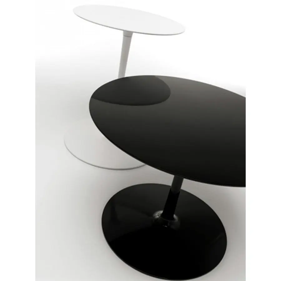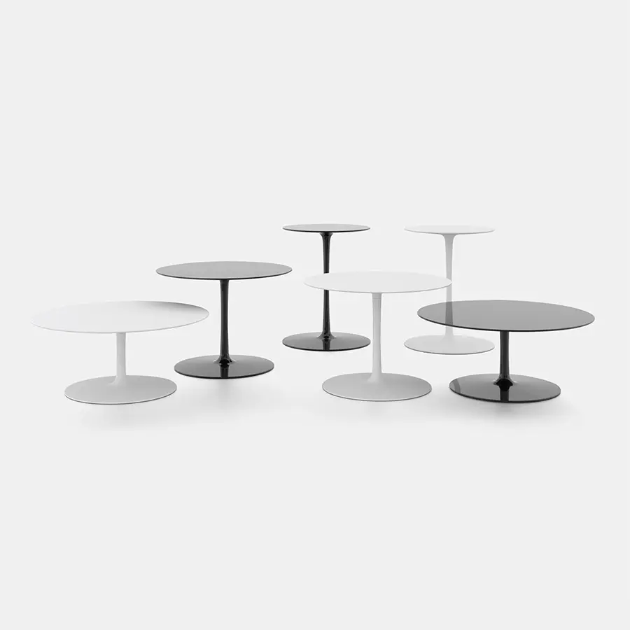 Mesas de centro redondas en tres dimensiones. Base con pata central de aluminio, lacado en blanco mate o negro brillante. Tableros de mesa en cristalplant® blanco mate o ceramilux® negro brillante.