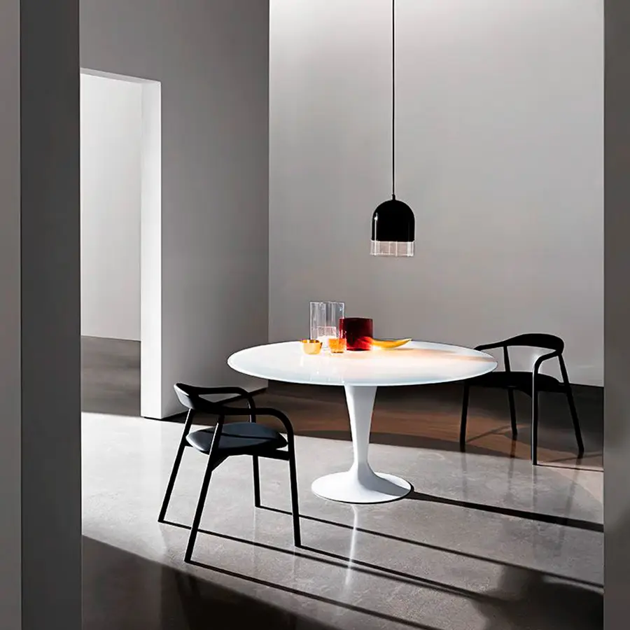 La mesa Flute de Sovet es elegante y sofisticada como el vaso del mismo nombre, esta mesa expresa diferentes personalidades según los materiales y las combinaciones de colores elegidas: la tapa puede ser lacada, Materia, madera,