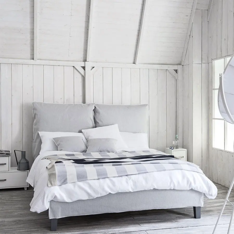 Cama revestida desenfundable con estructura desmontable, caracterizada por un amplio cabecero compuesto por dos grandes cojines. Una cama con una forma acogedora y atractiva. Todo, en una uniformidad visual lograda gracias a la estructura textil que combina perfectamente con las patas de madera maciza, ligeramente ocultas por un faldón de tela y disponibles en los colores: nogal natural, negro, blanco, gris, océano o tórtola.