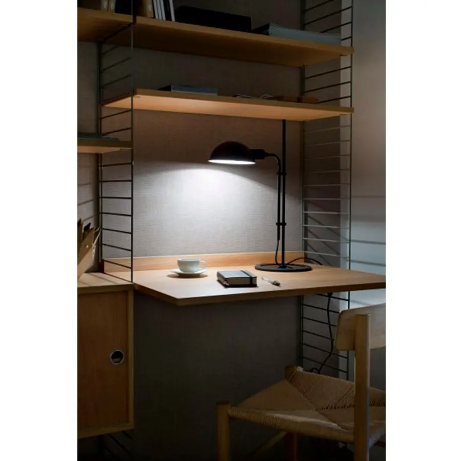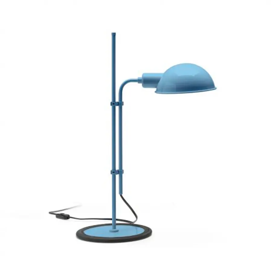 La pantalla ofrece una rotación de 360º para dirigir el haz de luz hacia donde convenga. La Funiculí sobremesa tiene una goma que recubre el contorno de la base para evitar el contacto frío del metal con la mesa y añadir estabilidad a la lámpara. Está disponible en negro, blanco, rojo, beige, gris musgo y un nuevo color, azul.