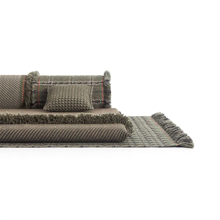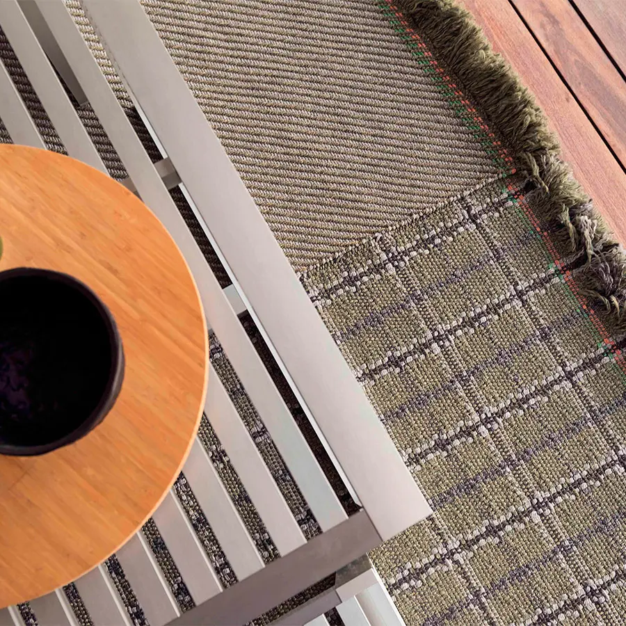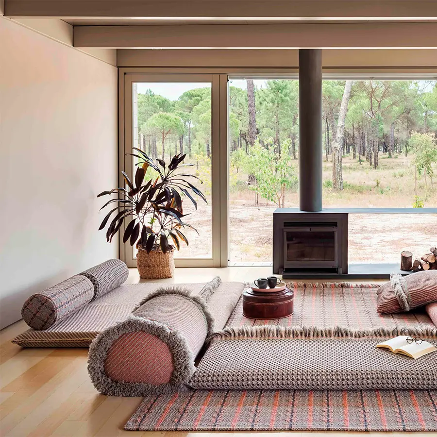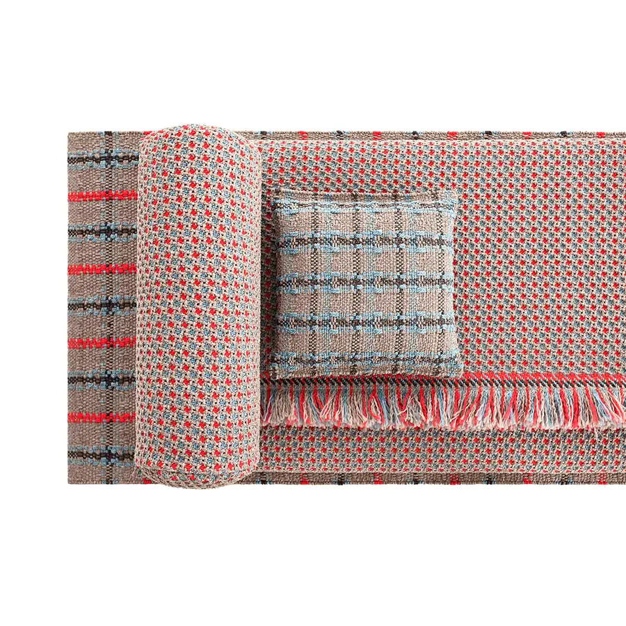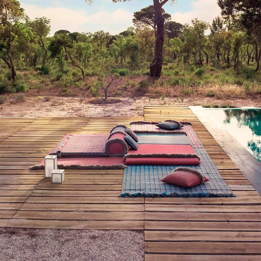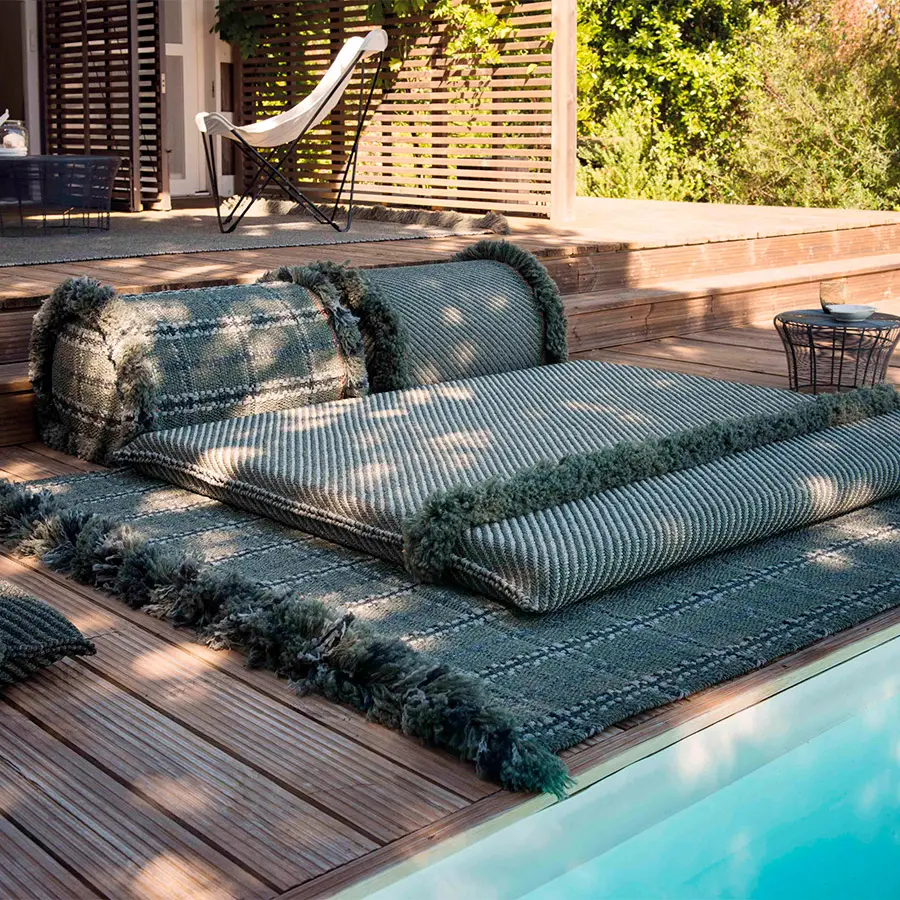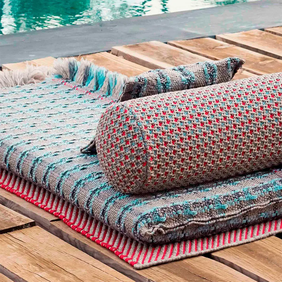 La colección Garden Layers, elaborada con materiales y tejidos especiales para un uso en ambientes exteriores, está compuesta por colchonetas, rulos, cojines, camas y mesas auxiliares. Fabricada en telares mecánicos con agradables fibras de polipropileno al tacto, con distintos diseños y tonos de colores. Por su corte neutro, encaja con cualquier otro tejido de Garden Layers –aunque todos los modelos de esta colección están diseñados para que armonicen entre sí. La idea es jugar a combinar tejidos diferentes a modo de capas (de ahí, el nombre de la colección). En particular, este modelo encaja especialmente bien con las colchonetas pequeñas Checks, los rulos grandes Diagonal en un tono claro, los cojines grandes Diagonal en tejidos oscuros, las Indian beds dobles Gofre y las mesitas auxiliares de menor tamaño.