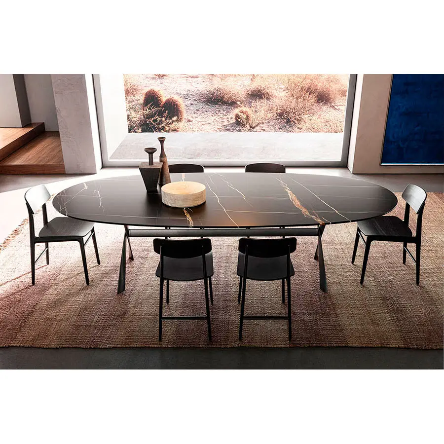 Base aluminio acabado zinc, cromo negro – Top en madera y mármol de la gama de acabados de Molteni.