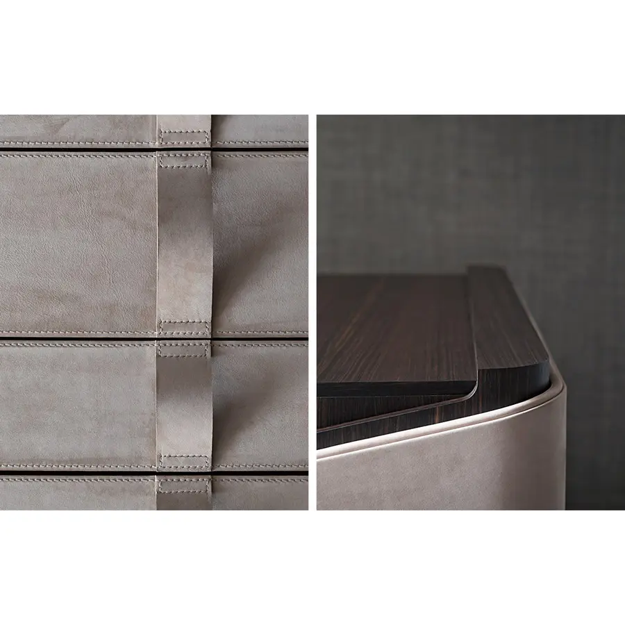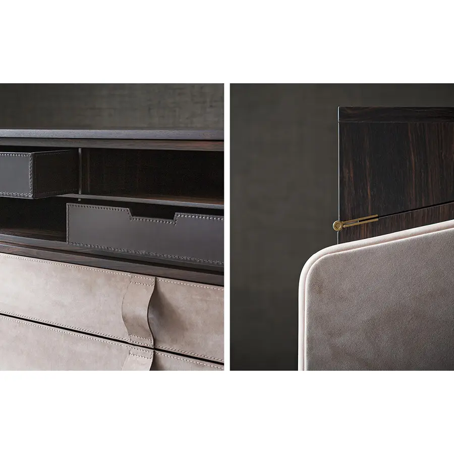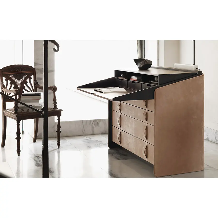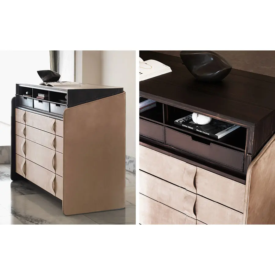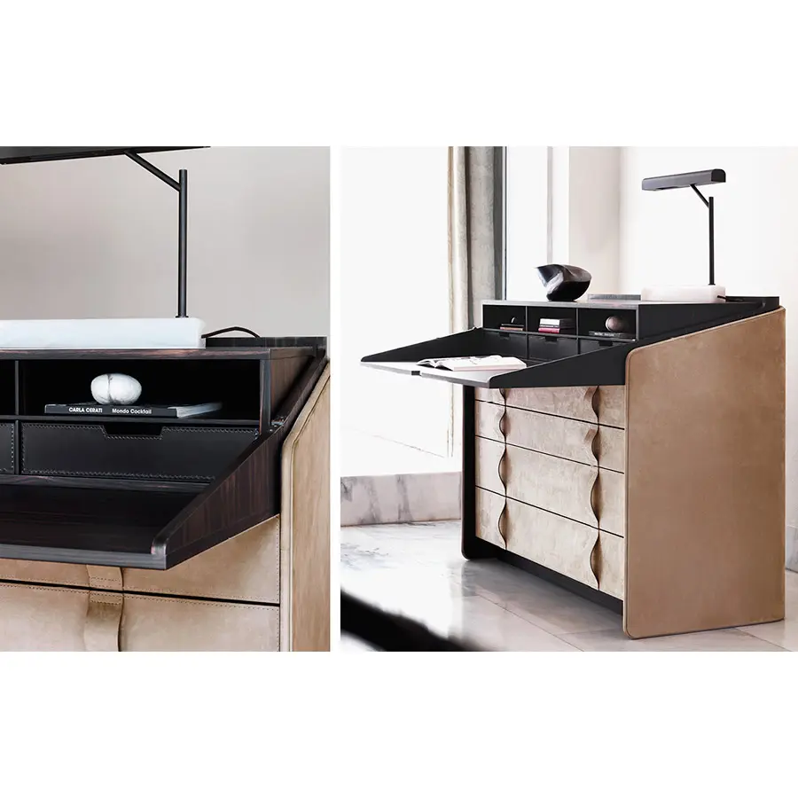 El secreter – escritorio con tapa proporciona distinción a la casa. La estructura de multicapa curvada está revestida externamente con piel, con el borde perimetral de piel tono-sobre-tono o bien en contraste, el interior es de ébano (con acabado mate). Son también de ébano la tapa y la rejilla, con tres bandejas extraibles de cuero marrón. Cuatro cajones grandes, con sistema automático de retorno, tienen los frontales y los tiradores de piel.