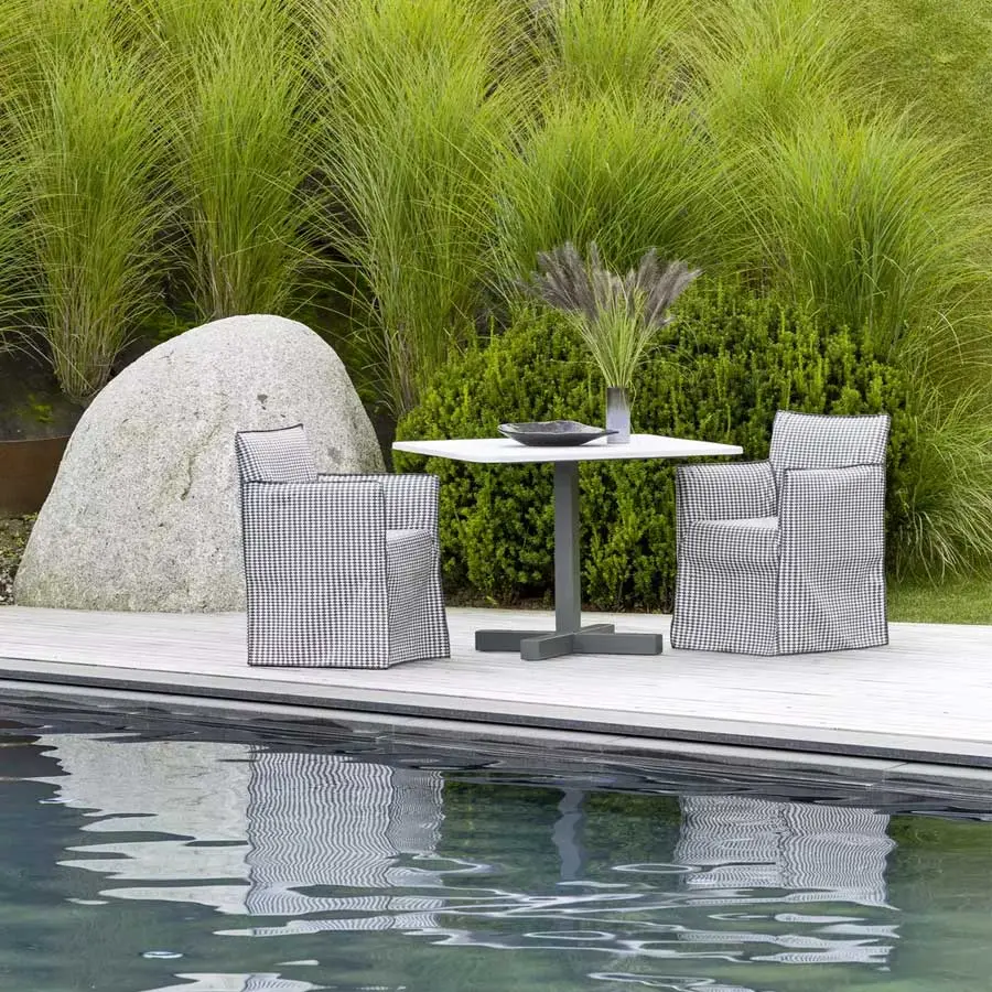 Familia de sillas acolchadas con fundas extraíbles, las Ghost Out 23/25 tienen un asiento cómodo y envolvente, con o sin brazos, que se desarrollan alrededor de una estructura ligera con volúmenes esenciales. Diseñados para resistir el agua y la luz solar y para conservar su forma y estética a lo largo del tiempo, se caracterizan por una estructura geométrica en la que la suavidad se acentúa con cojines sueltos. Su principal característica es la tapicería: una gran funda cuyo perfil está realzado por costuras vistas, para facilitar el desvestirse y adoptar una imagen diferente cada vez.